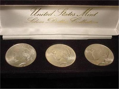 (3) Silver Dollars in Display Box 1922-1923-1924 BU