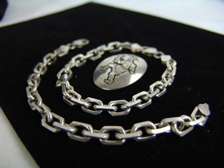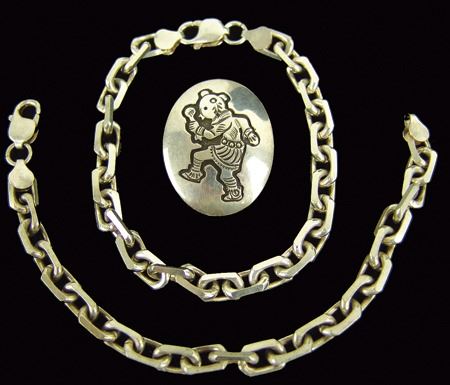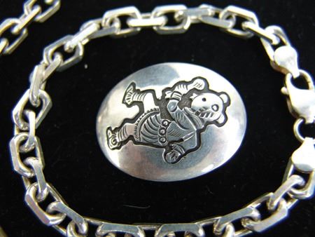 Late 1900, A small Hopi overlay pendant with mudhead dancer, plus two solid link bracelets marked "Vior-Italy-925." Very good condition, lot net weight 67g. Largest 9"