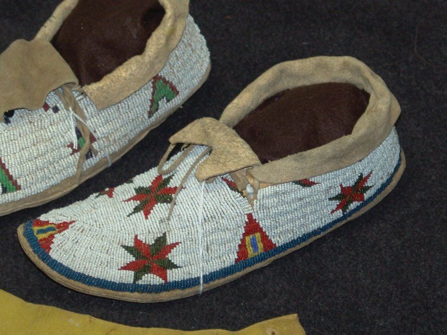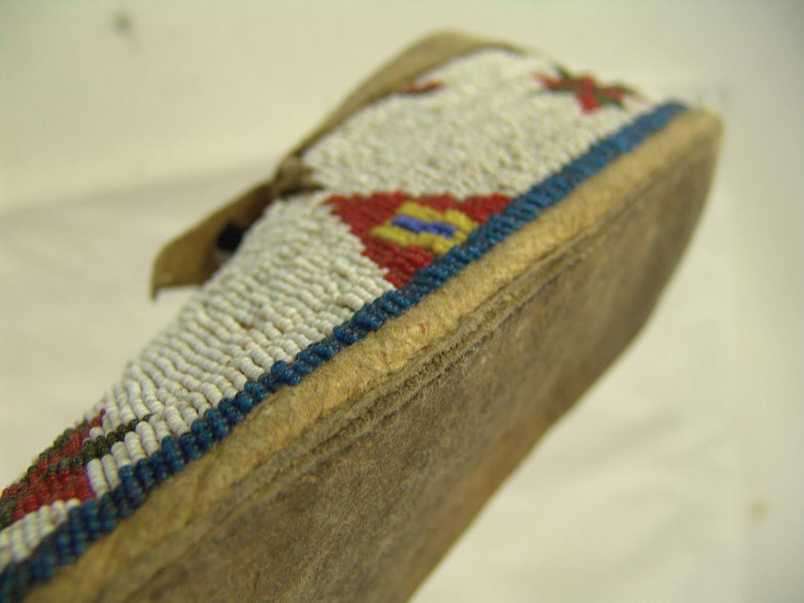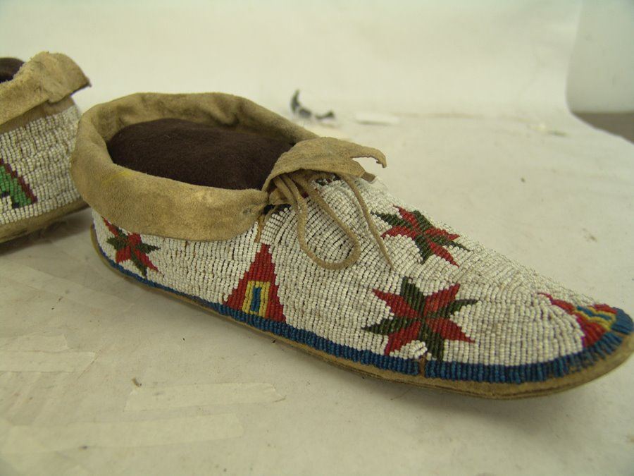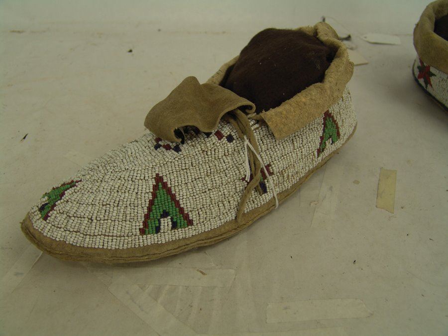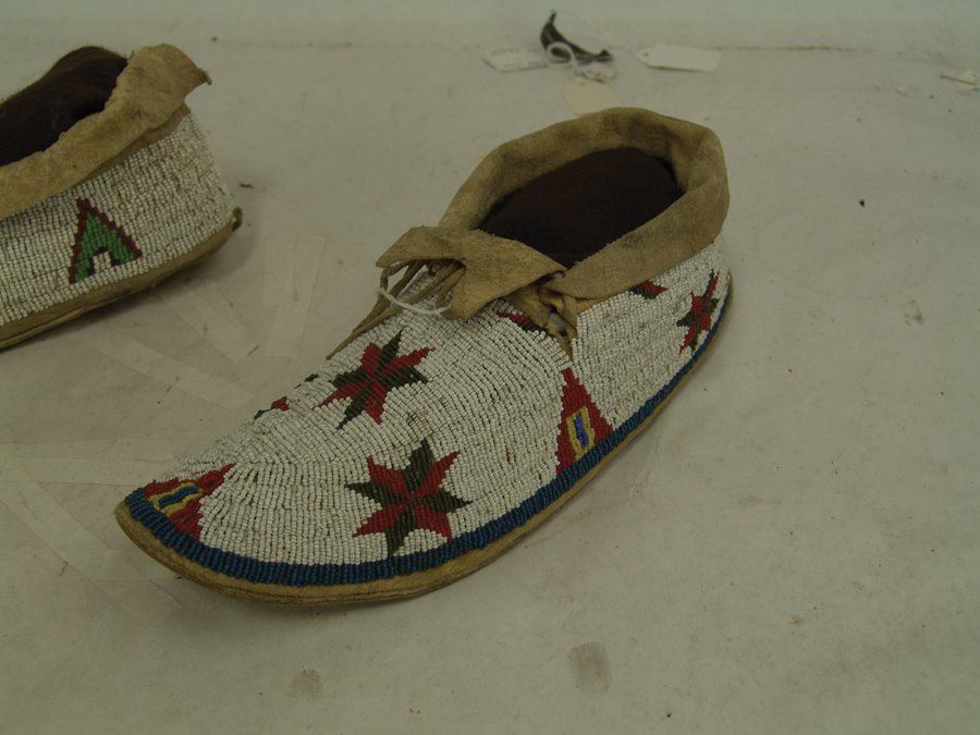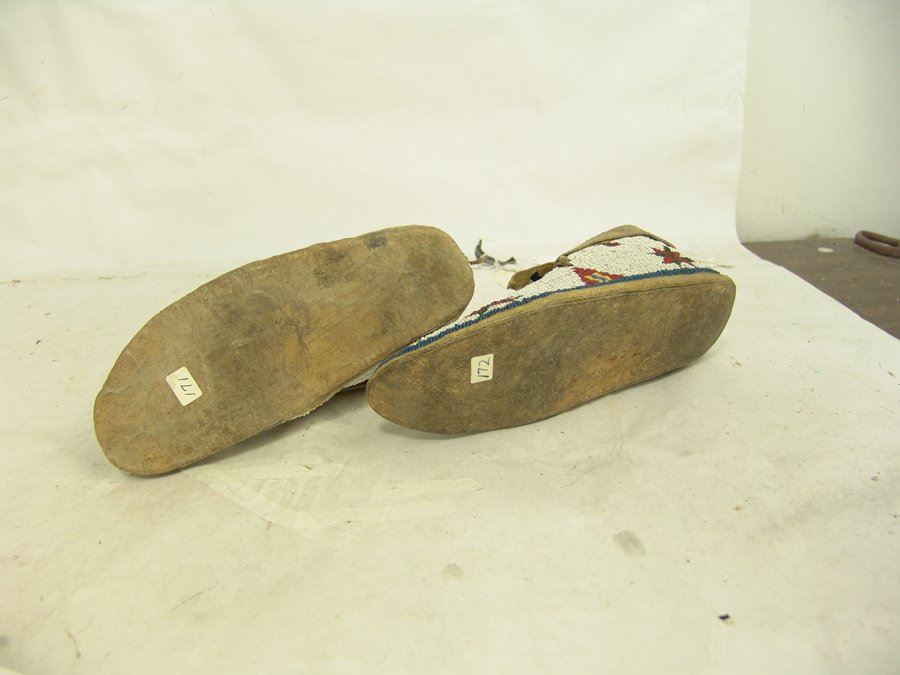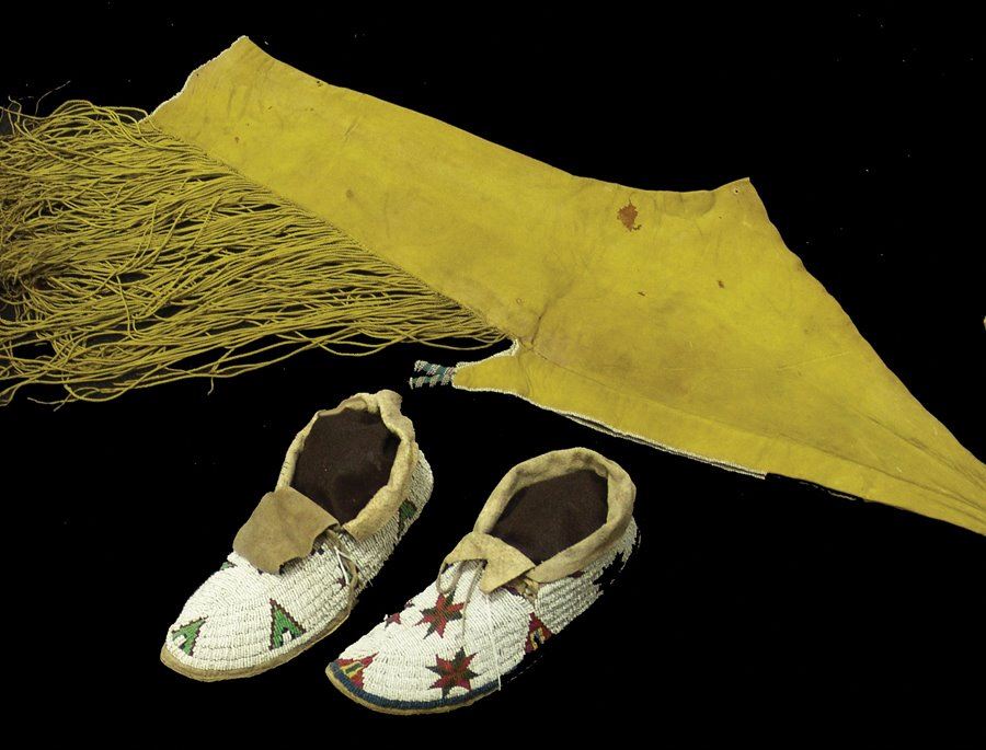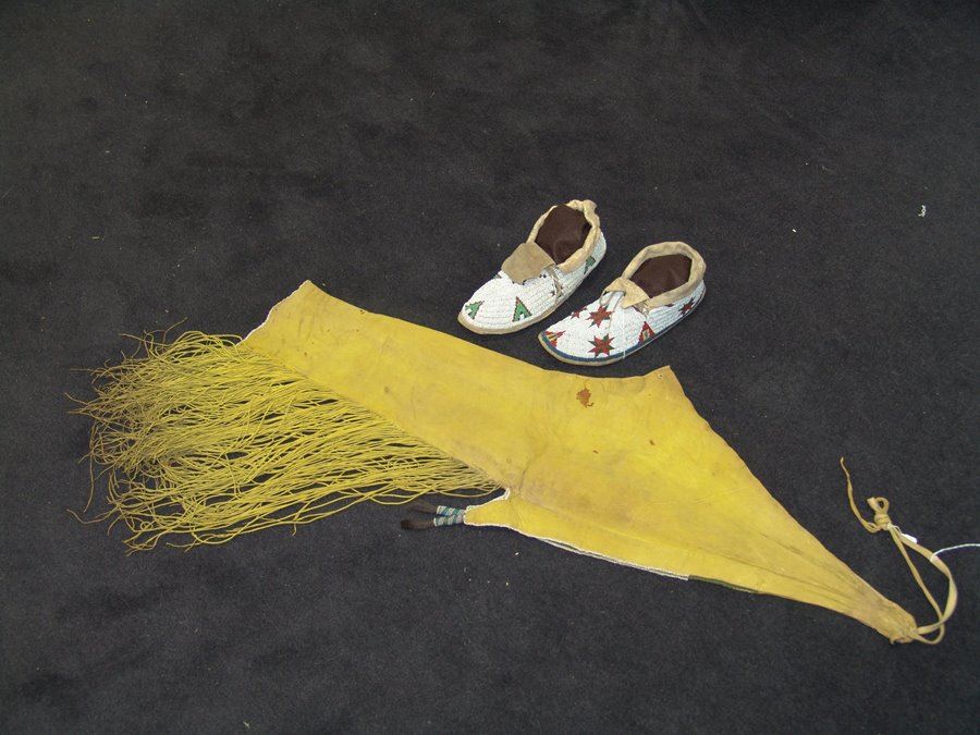 Three fantastic pieces which we dearly wish we had the mates to, two sinew sewn and lazy stitch bead Cheyenne buckskin moccasins with hard buffalo soles, plus a single yellow ochred Kiowa buckskin legging with buckskin,Early 1900s,11", 40" plus fringe