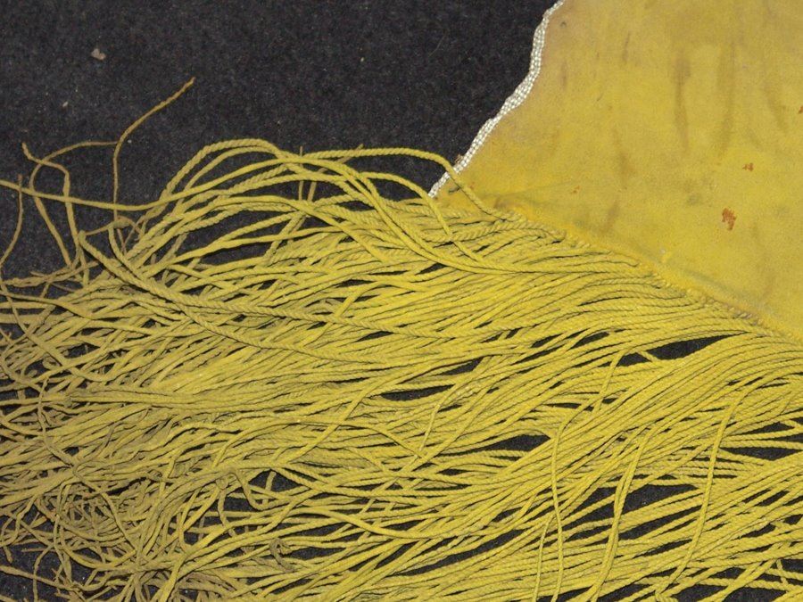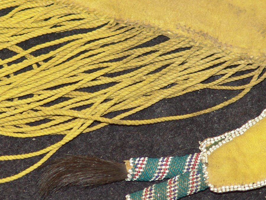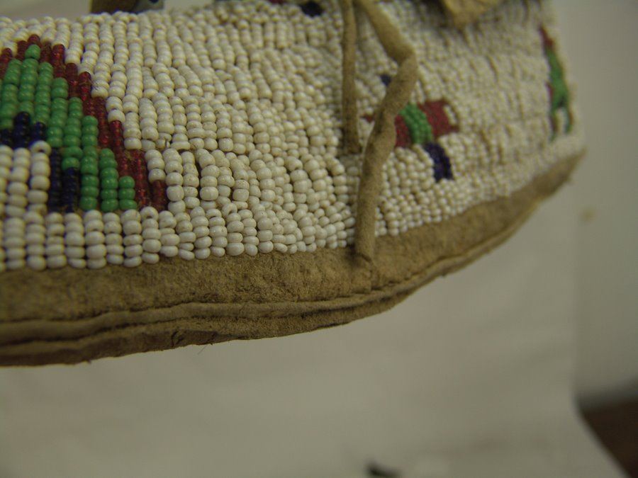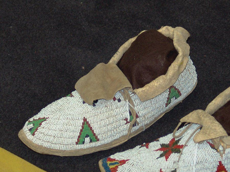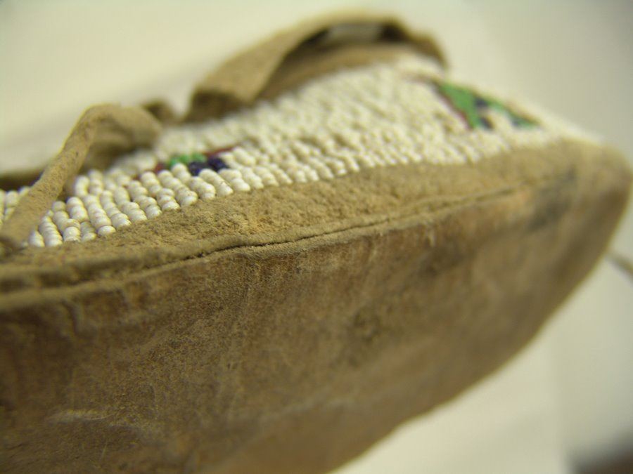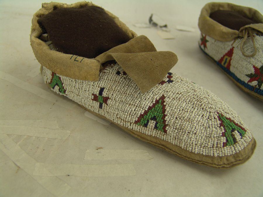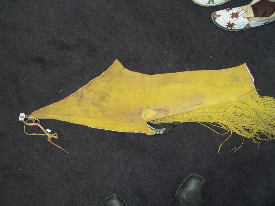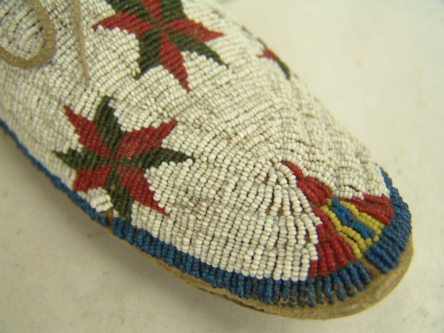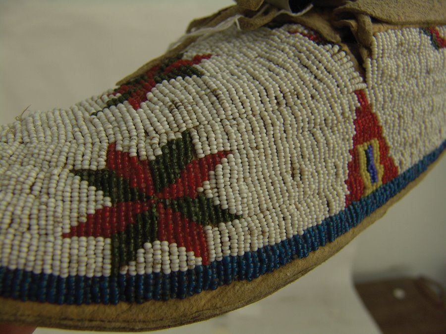 Three fantastic pieces which we dearly wish we had the mates to, two sinew sewn and lazy stitch bead Cheyenne buckskin moccasins with hard buffalo soles, plus a single yellow ochred Kiowa buckskin legging with buckskin,Early 1900s,11", 40" plus fringe