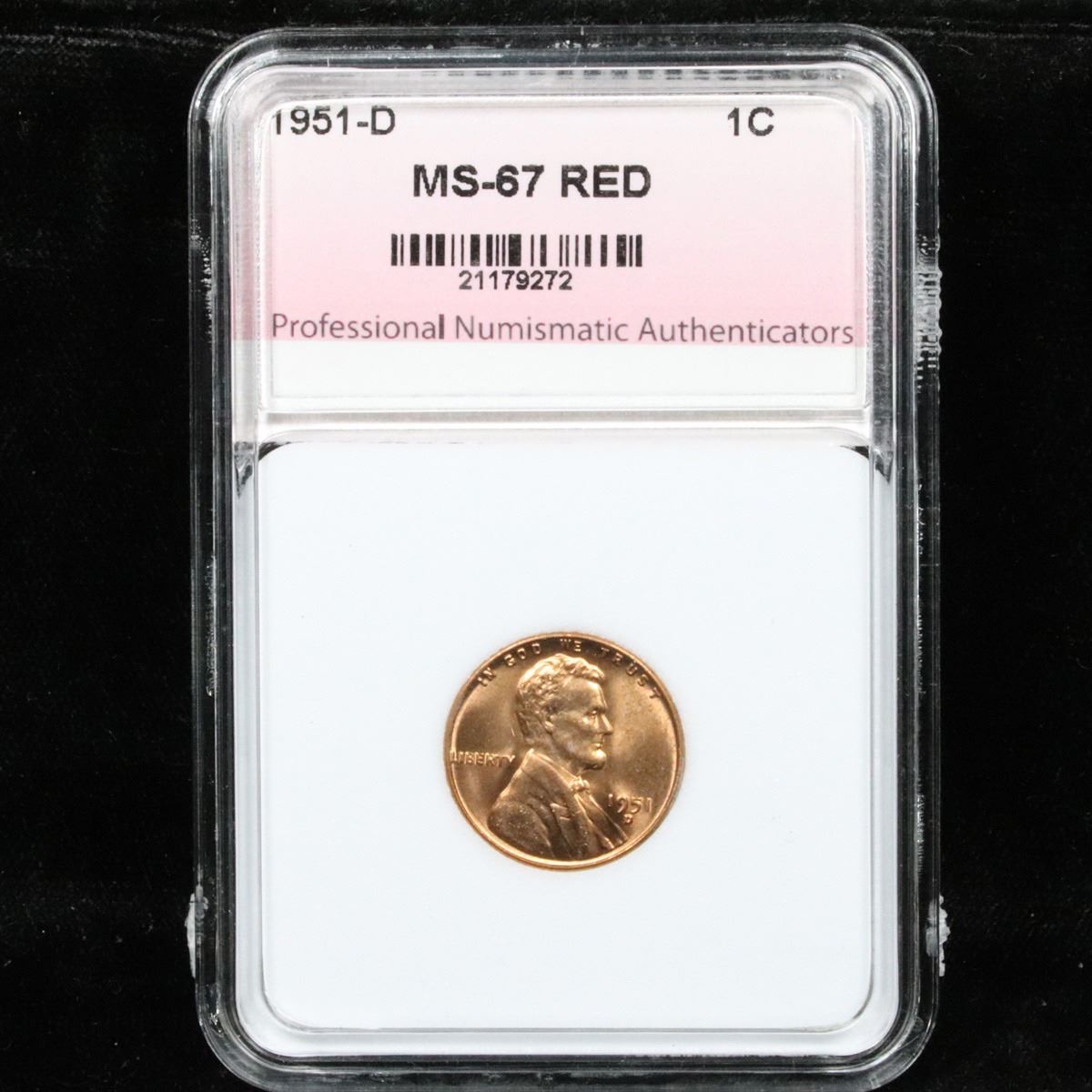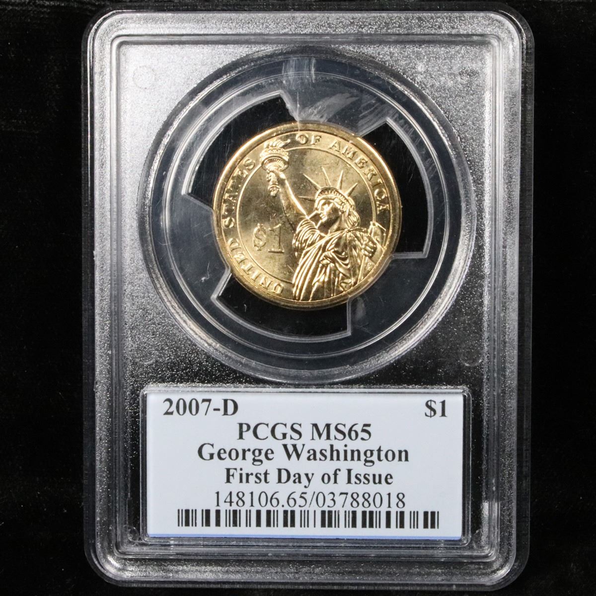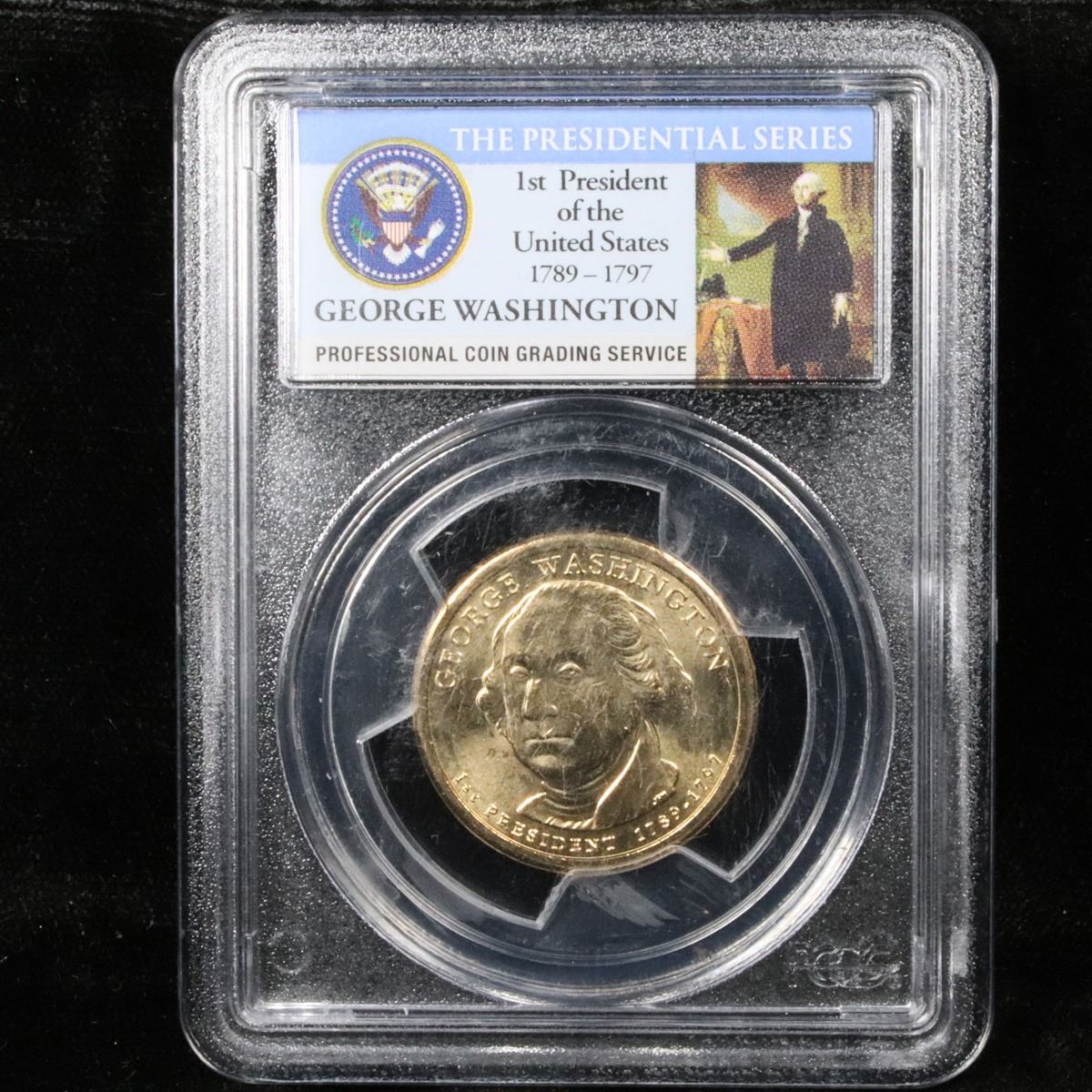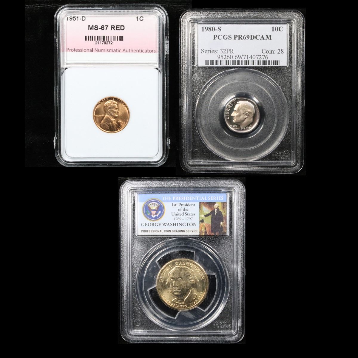 3 Slabbed Coins ( Lincoln 1c, Roosevelt 10c, Presidential $1) . .. The coins included in this lot are a 2007-p George Washington Presidential Dollar (Graded ms65 by PCGS), 1980-s Roosevelt 10c (Graded pr69 dcam by PCGS), and a 1951-d Linoln cent (graded ms67 rd by PNA)