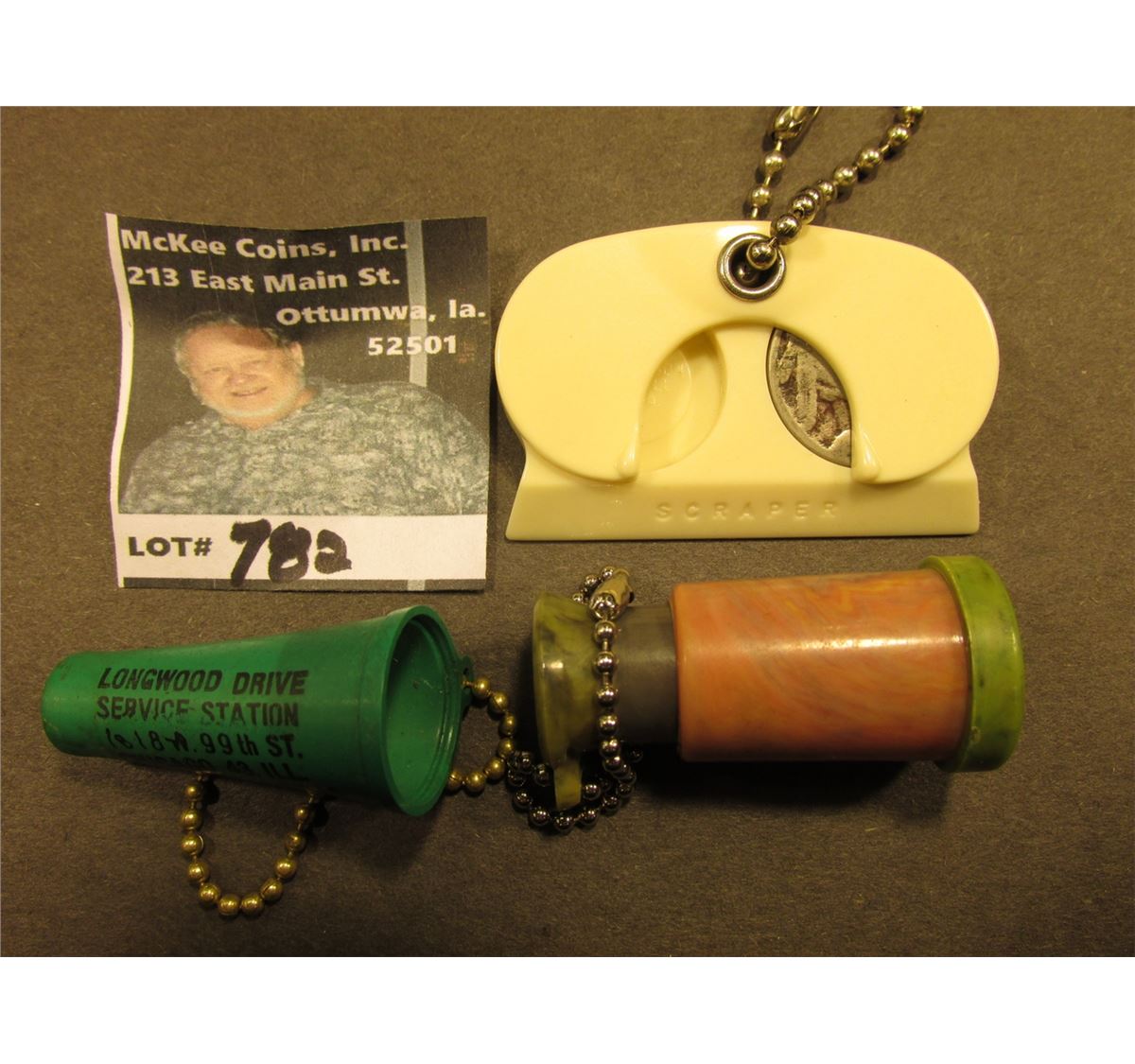 (3) Small advertising style Key-chains, one is a scope which peering through reveals a topp-less nude female, another contains an old Buffalo Nickel.