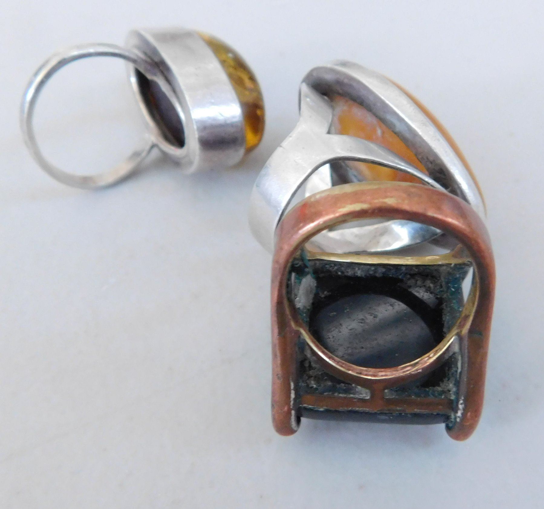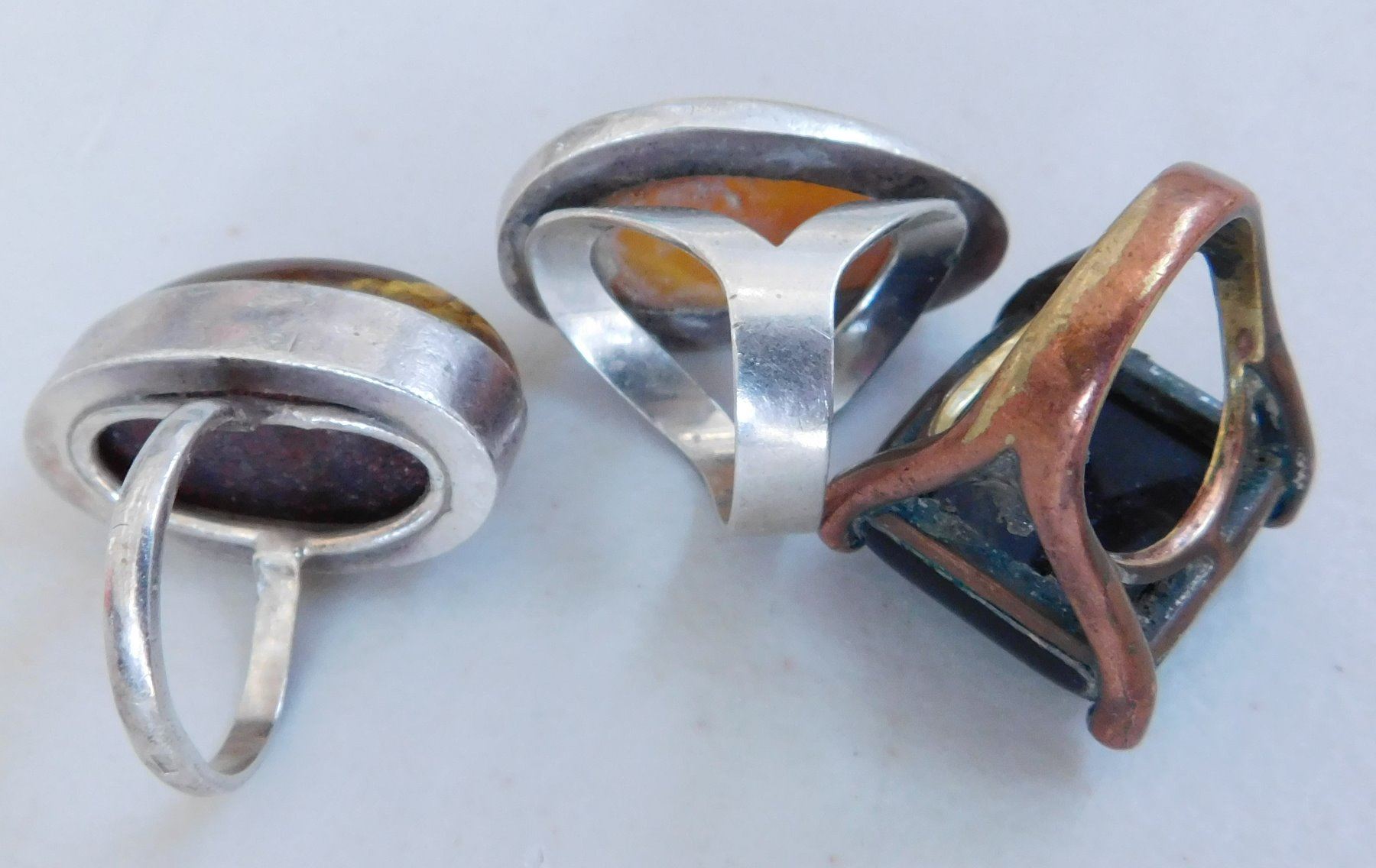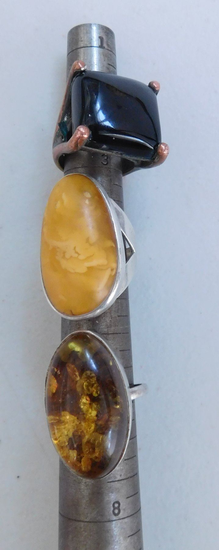 3 Southwest Rings, circa 1940s. Made of silver, amber, obsidian and copper, the items are approx. 1" x 1" x 1". Sizes are 7-7.25". Lot weight is 32.5 grams. Mexico, New Mexico. Condition: Worn, see images. Shipping: $14.50 w/insurance and signature.