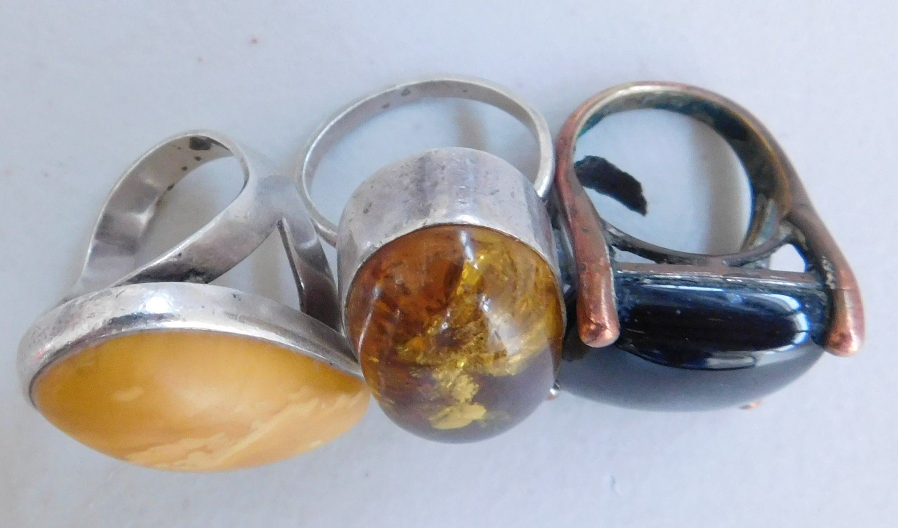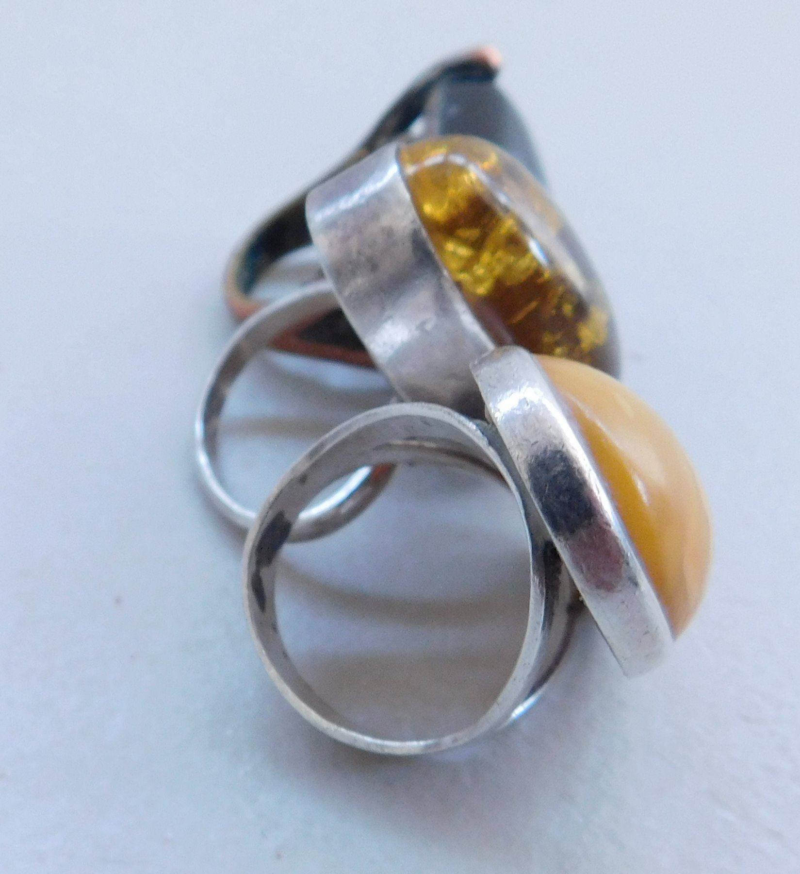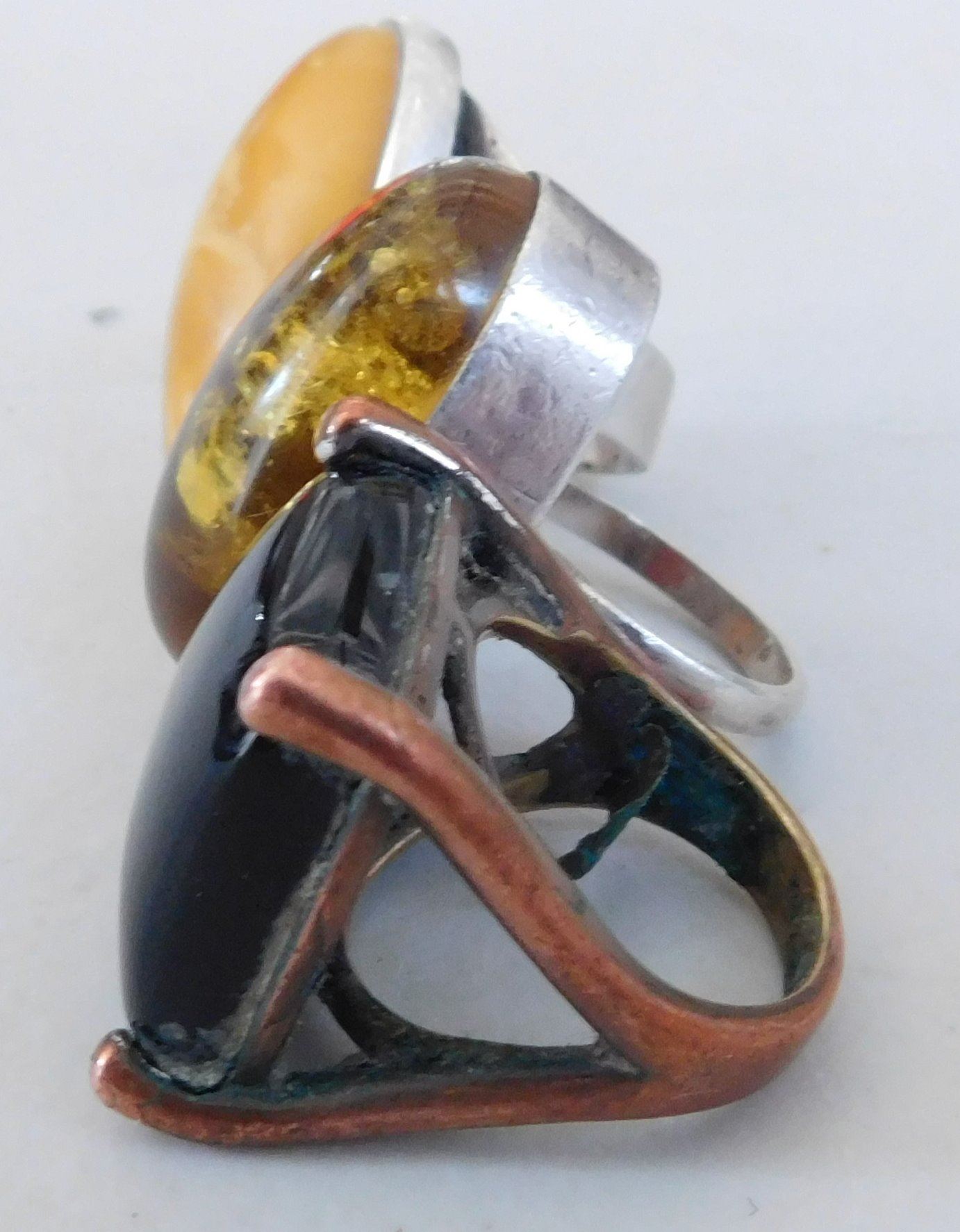 3 Southwest Rings, circa 1940s. Made of silver, amber, obsidian and copper, the items are approx. 1" x 1" x 1". Sizes are 7-7.25". Lot weight is 32.5 grams. Mexico, New Mexico. Condition: Worn, see images. Shipping: $14.50 w/insurance and signature.