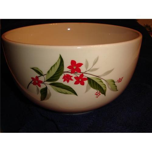 This is for 3 Universal Cambridge Stacking Bowls with 1 lid for the small bowl. They are in the Woodvine Pattern. The large bowl is 7.5" wide, 4.25" high. Condition is very good. It does have used look on inside of bowl, but outside is very shiny and no crazing. Middle bowl is 5.25" wide, 3.75" high. The condition is good. It has alot of wear, crazing on inside bottom of the bowl. The outside has general crazing all over but bottom one-third is crazed more, with glaze crack in one inch section. Still very shiny. Smallest bowl is 4" wide, 3.25" high. It is very good condition. It is very shiny inside and out. No crazing, very little usage look. It has its lid, which is in very good condition. Does show its age. No chips, cracks, just crazing and one glaze crack. All the bases are stamped in gold with Universal-Cambridge,O. Oven Proof. Made in U.S.A. This pattern will not fade it is Permacal.