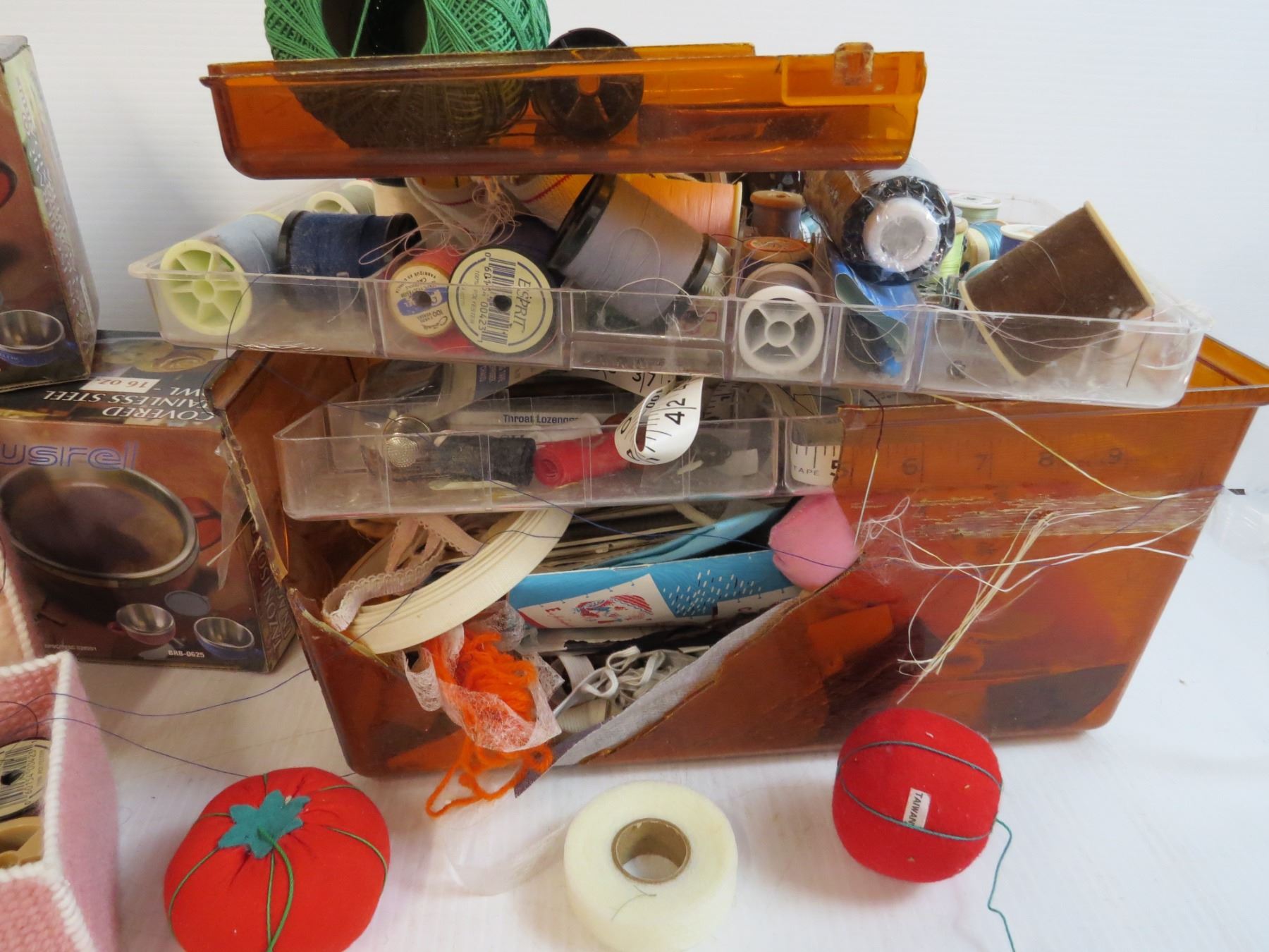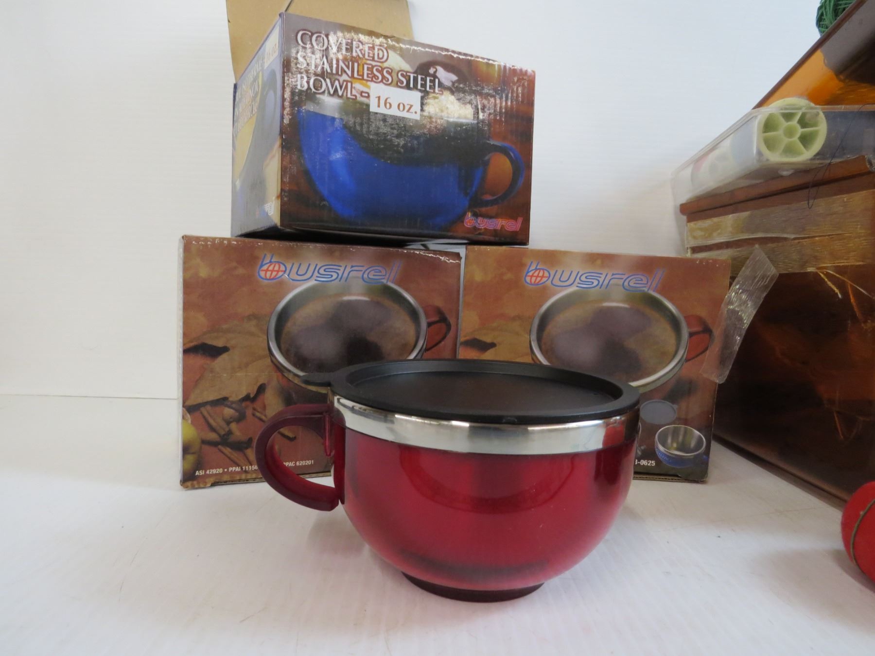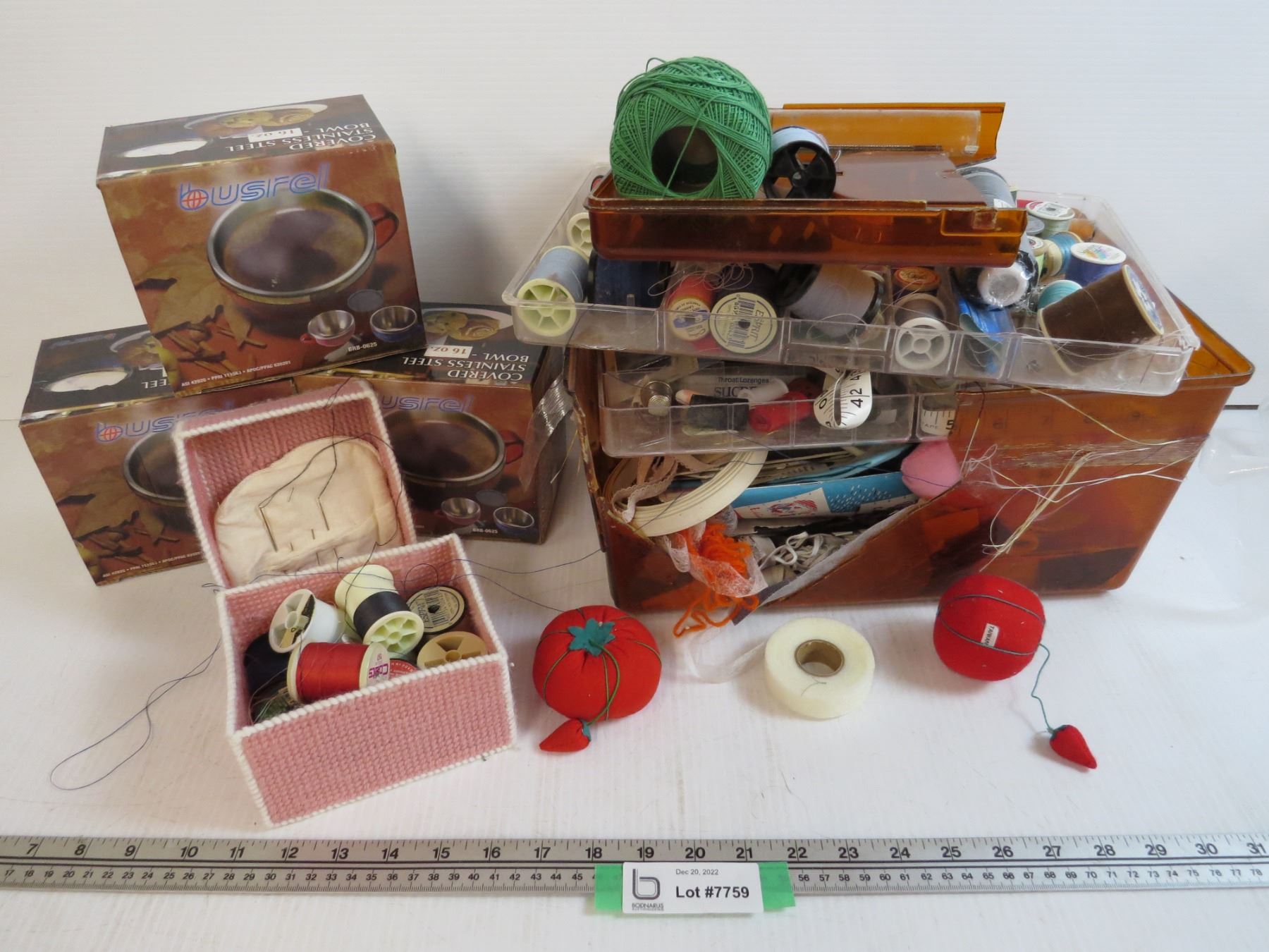 (3) Stainless Steel Bowls - Broken Sewing Container & Contents