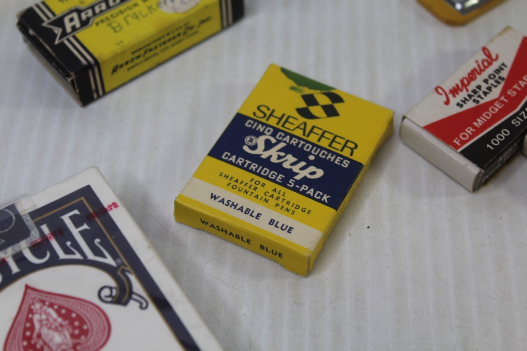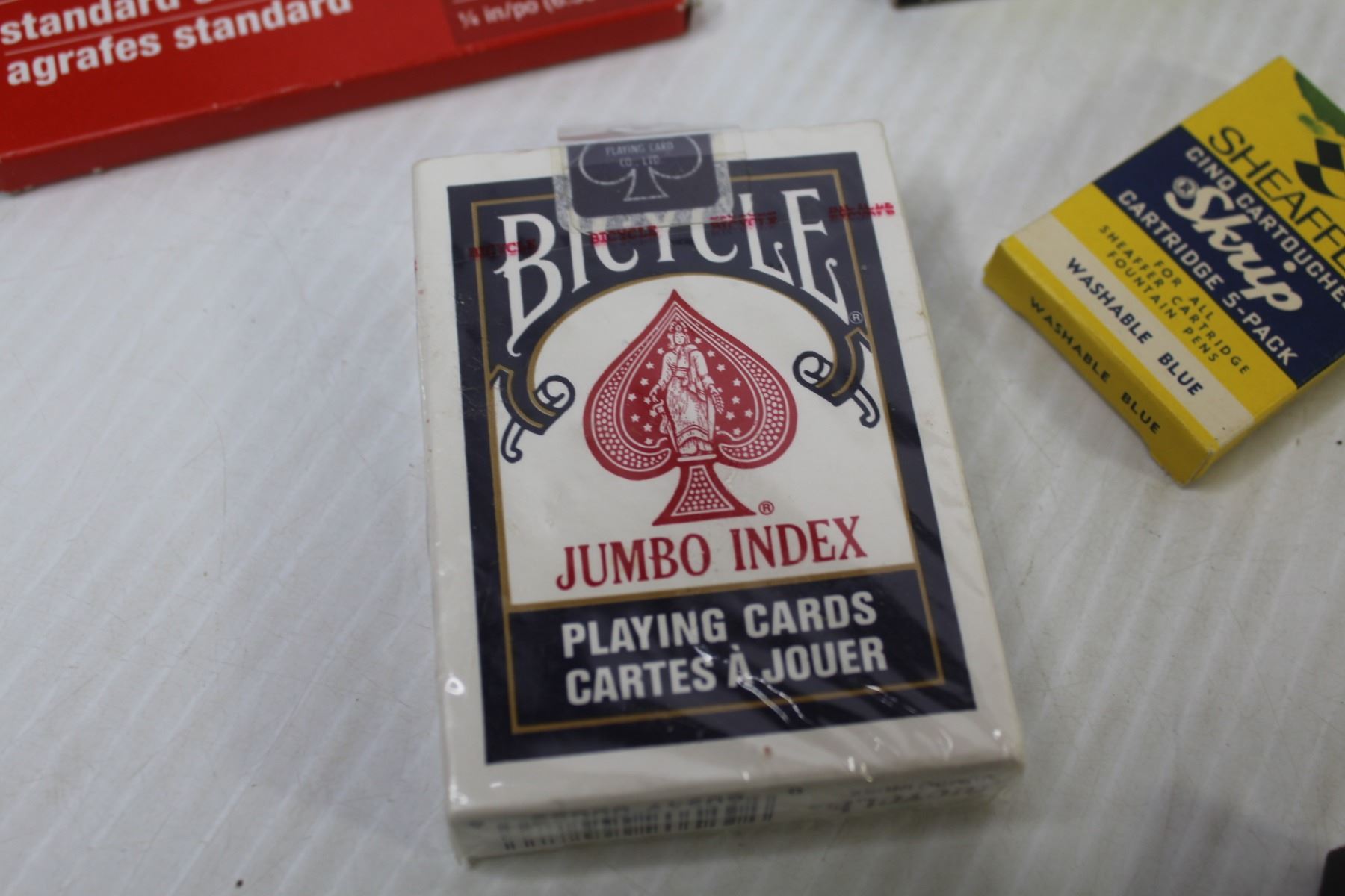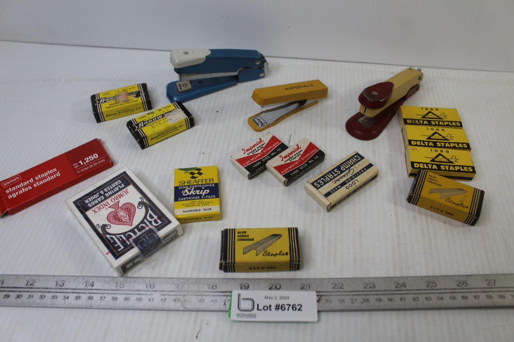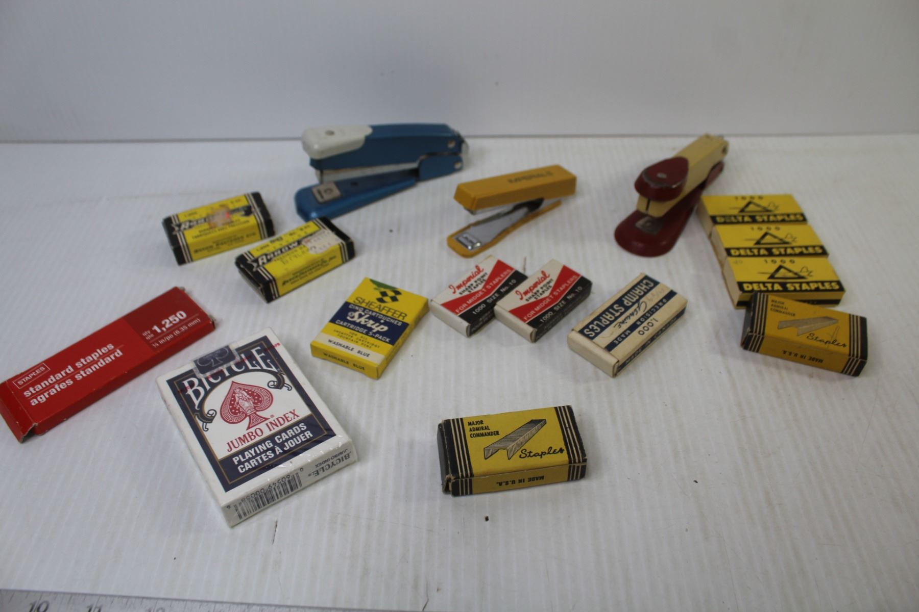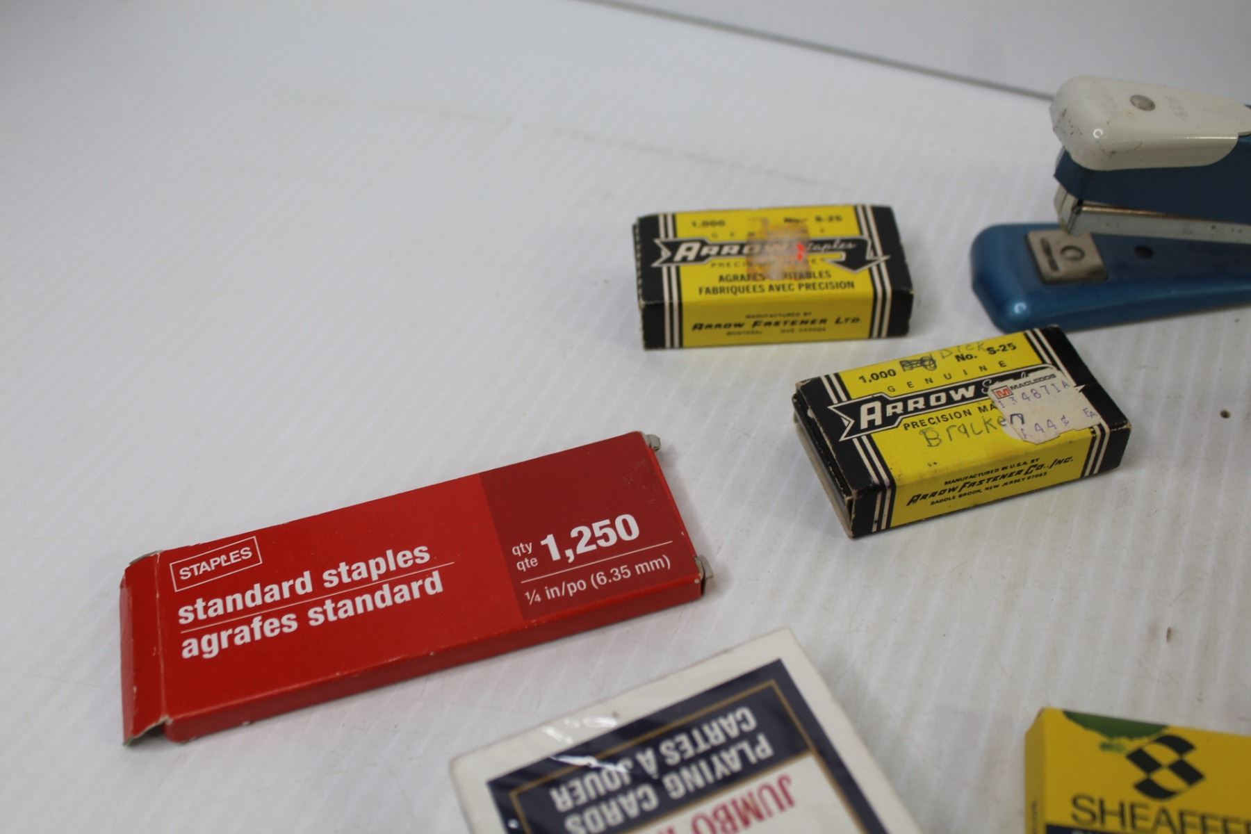 (3) Staplers w/Packages of Staples - Bicycle Playing Cards - Sheaffer Ink Cartridges