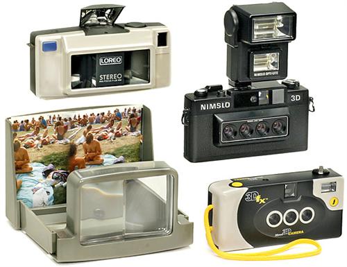 3 Stereo Cameras 35 mm 1) "Nimslo 3D", 1980, Nimslo Corporation. With Quadra lens 30 mm, for 4 exposures 18 x 24 mm, with flash Opti-Lite. - 2) "Loreo Stereo", 1990. Loreo Asia Ltd., Hong Kong. Mirror system on 35-mm film (1x 24 x 36 mm), Pan Focus lens 11/28 mm, shutter 1/100 sec., with original stereo viewfinder for 10 x 15 cm prints. - And: 3) China. "3 D fx camera", 1990s, China. For 3 exposures 18 x 24 mm. With box and instruction manual. - Cameras not tested.<Br>