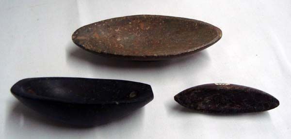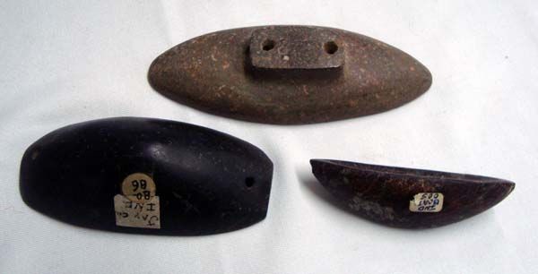 3 Stone Boat Tools, two with drill holes, largest measures approx. 5 1/8 '' L x 2''W.  Two have drill holes.  What is a boat stone, no one seems to know.  Possibly a weight for an atl atl.  Age & Origin Unknown.