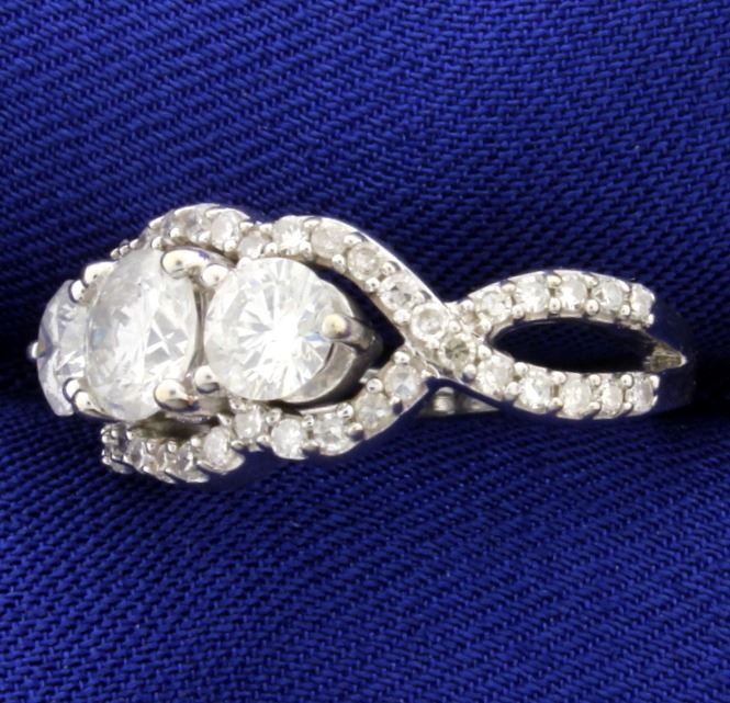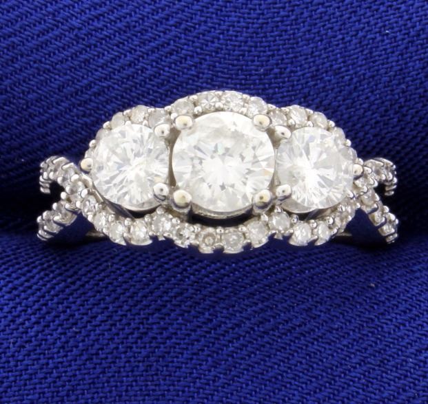 In 14K white gold. The center stone is 7 ct, F color/ SI-2 clarity, 2-side stones are .4 ct each, F color/ SI-2 clarity, 50-.01 ct diamonds surrounding diamonds. Size 5.5 5.9g