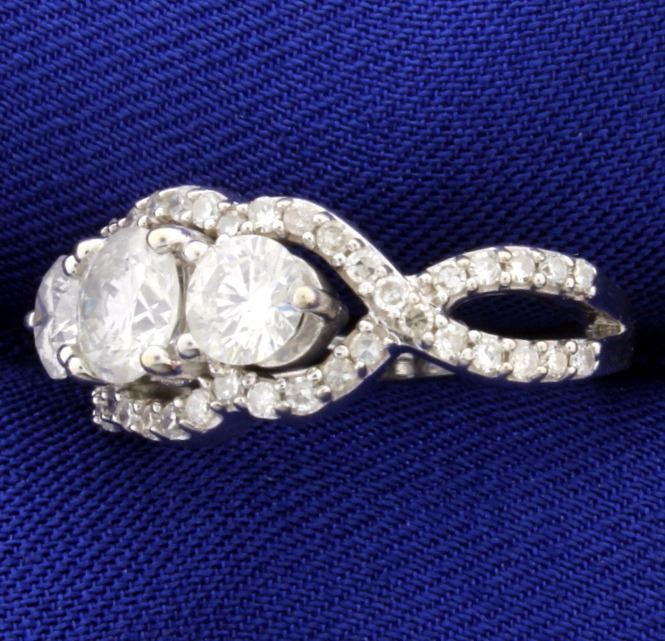 In 14K white gold. The center stone is .7 ct, F color/ SI-2 clarity, 2-side stones are .4 ct each, F color/ SI-2 clarity, 50-.01 ct diamonds surrounding diamonds. Size 5.5 5.9g