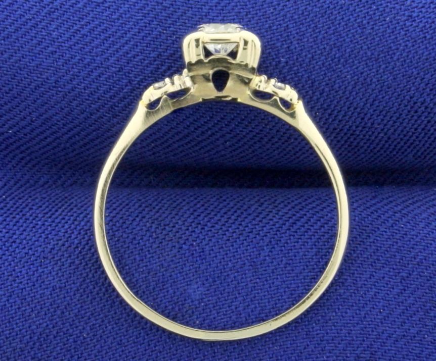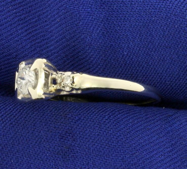 In 14k white gold. Center diamond is high quality round brilliant .35ct, H color/I clarity.  It is surrounded by two high quality .03ct diamonds on each side, SI clarity/H color. Size 9 1/4. 2.5g.