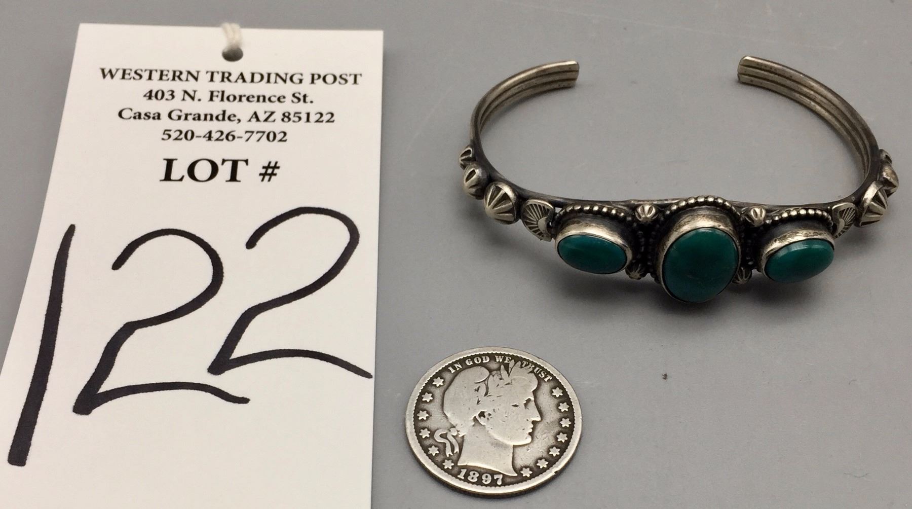 Maker: B. Johnson, Navajo. Approx. Age: Fairly modern. Size: Inside circumference 5 3/8” with an additional 1” opening (fits 6 3/8” wrist). approx. 3/4” at it’s widest and weighs 21.6 g. Additional Info: 3-stone, retro style, Navajo turquoise and sterling silver cuff bracelet. Condition: Good, normal wear expected. New, old stock (NOS). Please look closely at the pictures - they are an important part of our description. Shipping: There will be a $5 handling / packaging fee for shipping this lot. The actual cost of postage will be added on top of that.