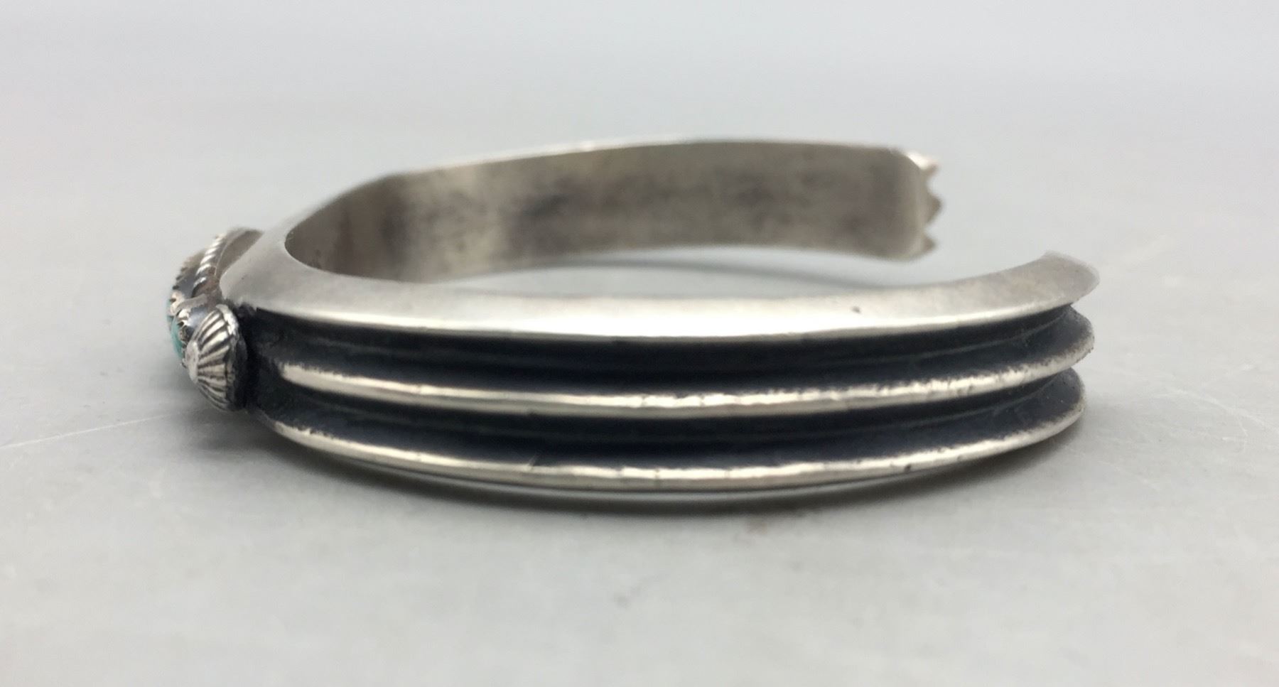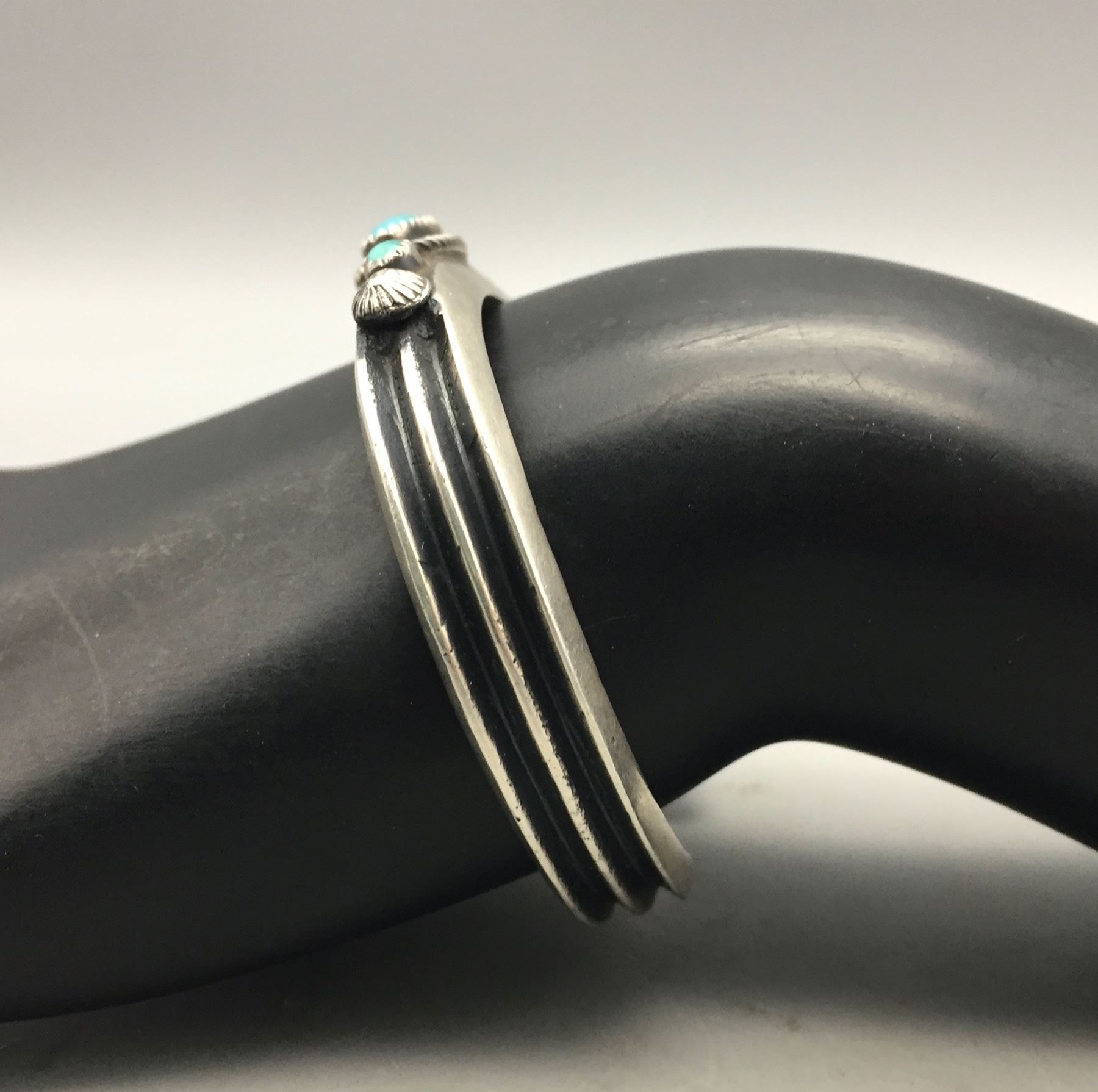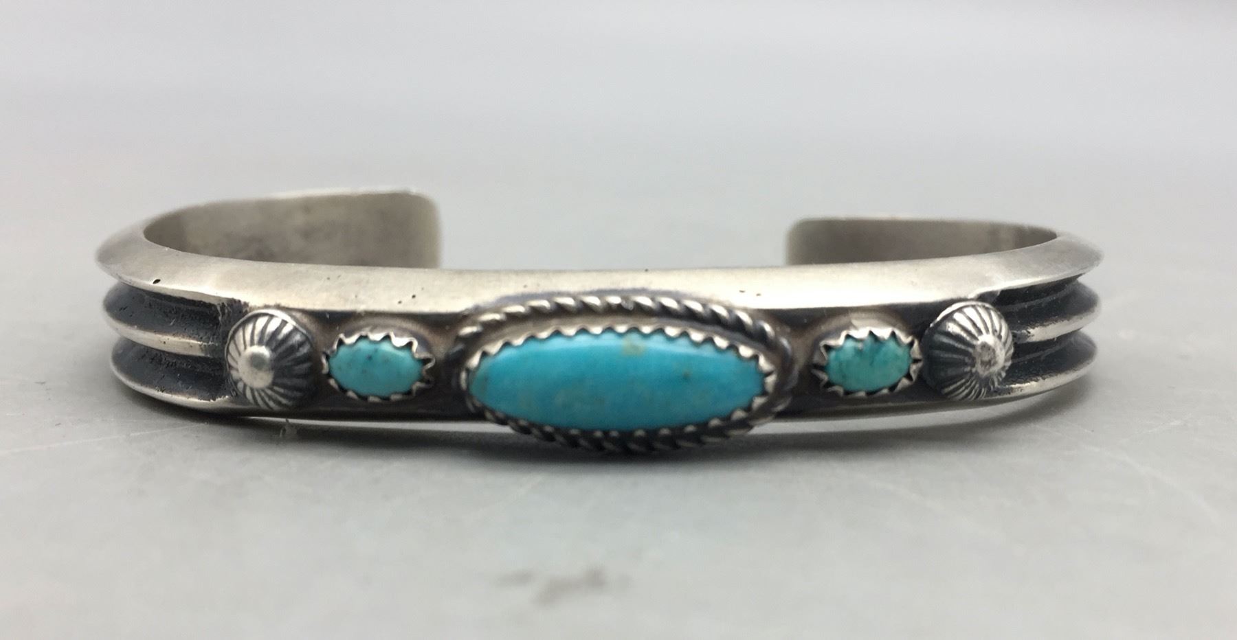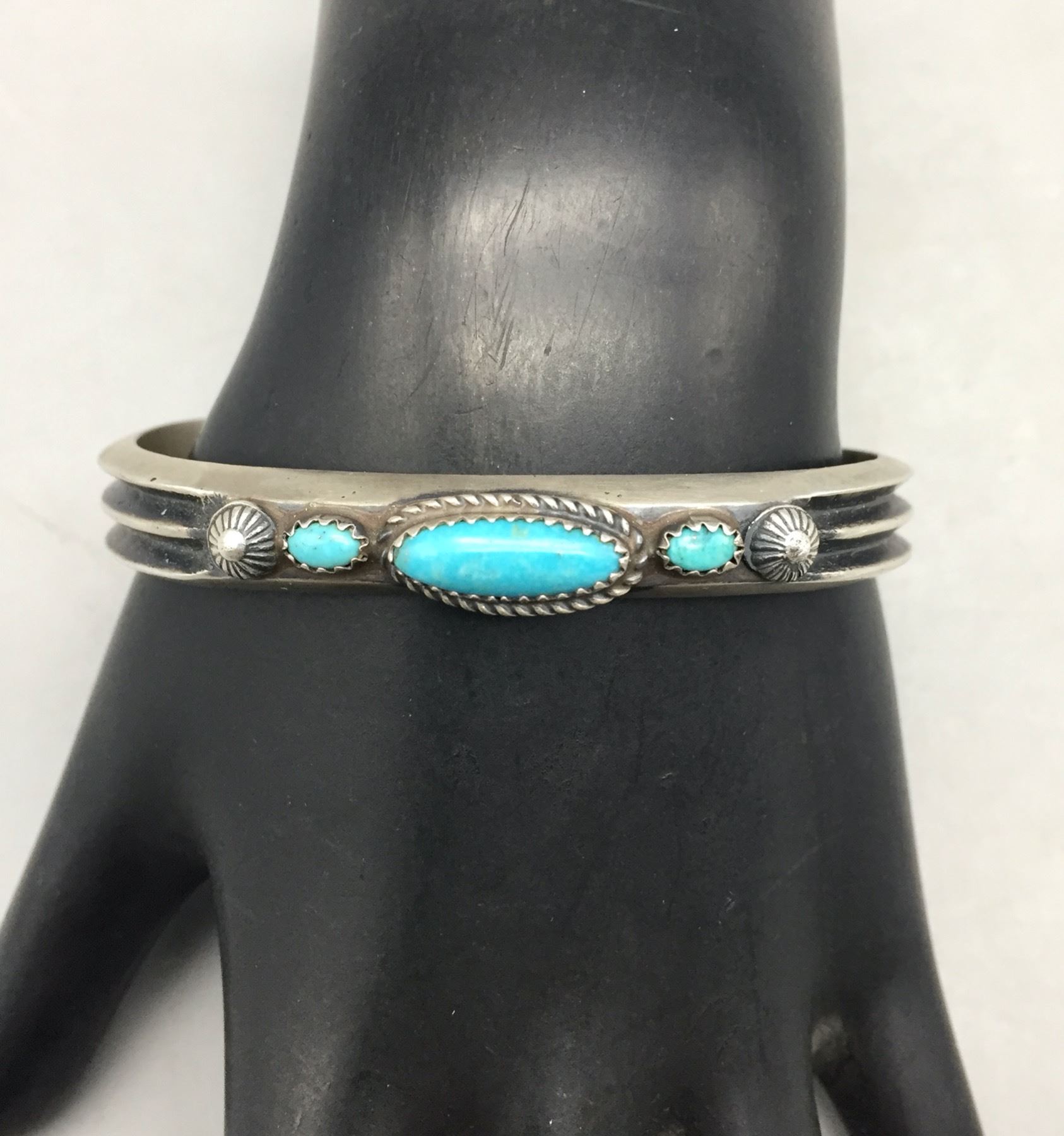 Description: For sale in this lot is a deeply channeled sterling silver bracelet set with three turquoise stones. Bracelet is stamped as sterling silver. Maker: Hallmarked SM. Approx. Age: Modern. Size: Inside circumference measures 5-1/2†long. Opening is additional 1-1/4â€, fitting a 6-3/4†wrist. Width is 3/8â€. Weighs 37 grams. Condition: Good for its age, normal wear expected. Please look closely at the pictures - they are an important part of our description. Shipping: There will be a $5 handling / packaging fee for shipping this lot. The actual cost of postage will be added on top of that.