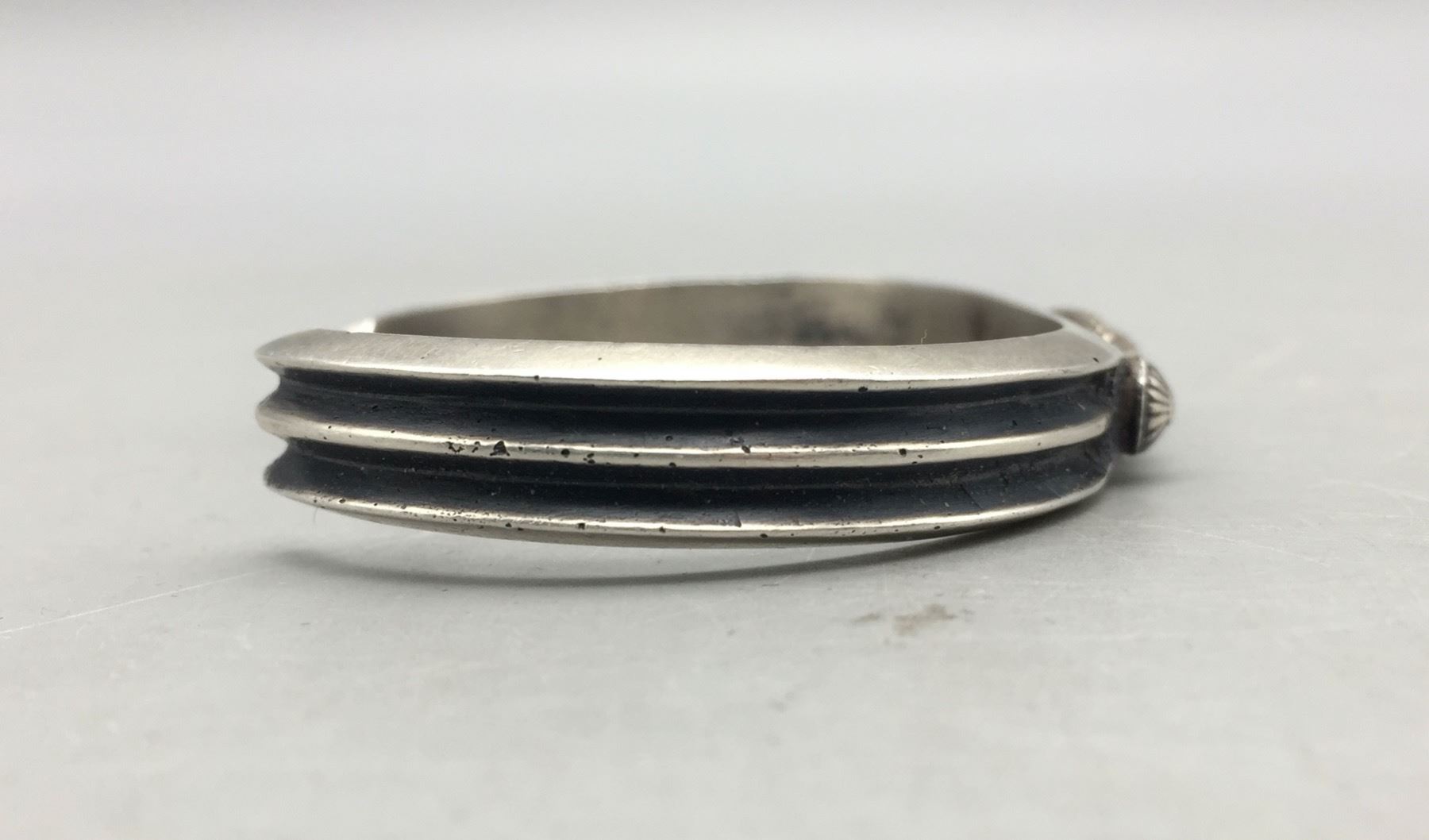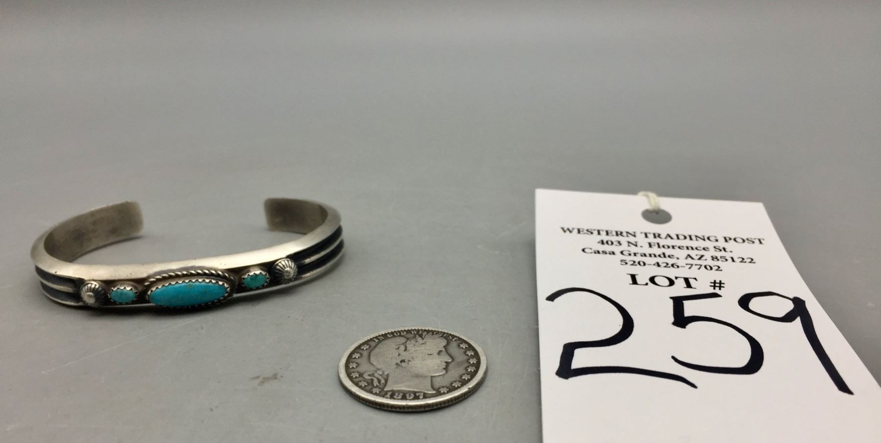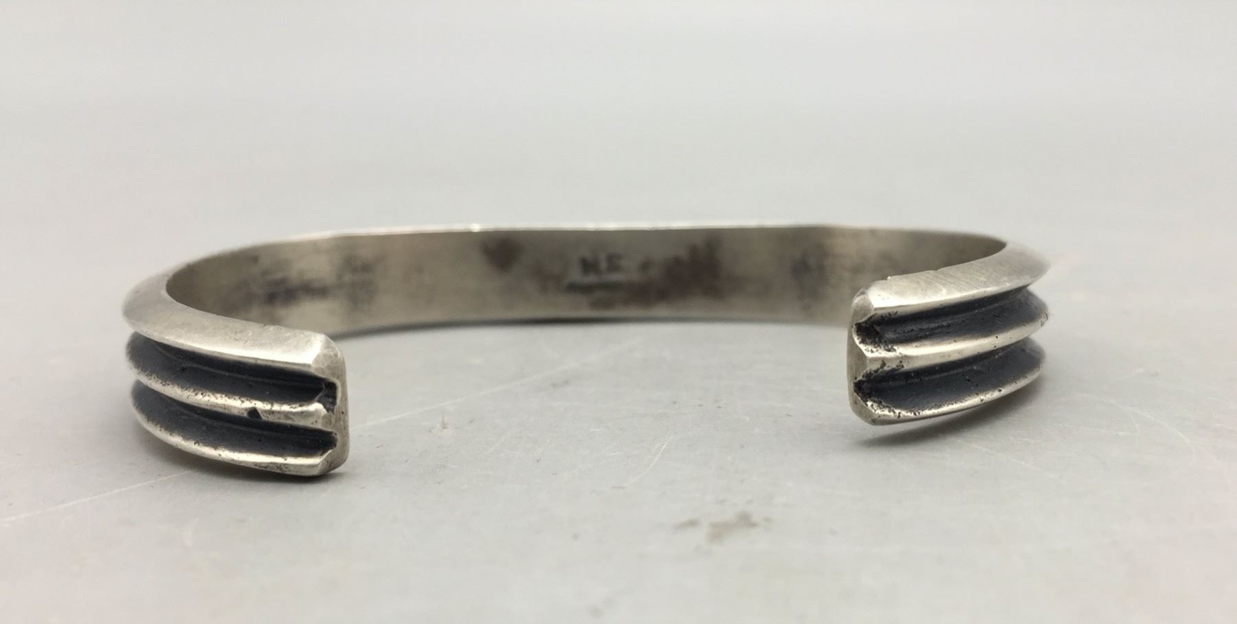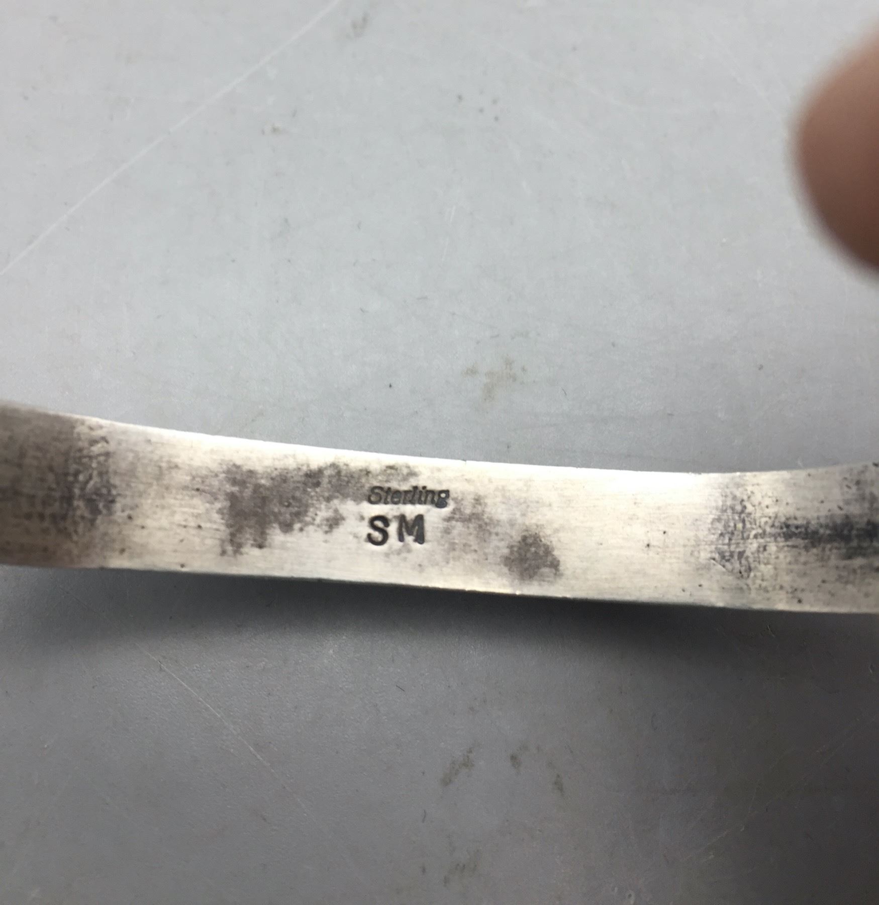 Description: For sale in this lot is a deeply channeled sterling silver bracelet set with three turquoise stones. Bracelet is stamped as sterling silver. Maker: Hallmarked SM. Approx. Age: Modern. Size: Inside circumference measures 5-1/2†long. Opening is additional 1-1/4â€, fitting a 6-3/4†wrist. Width is 3/8â€. Weighs 37 grams. Condition: Good for its age, normal wear expected. Please look closely at the pictures - they are an important part of our description. Shipping: There will be a $5 handling / packaging fee for shipping this lot. The actual cost of postage will be added on top of that.