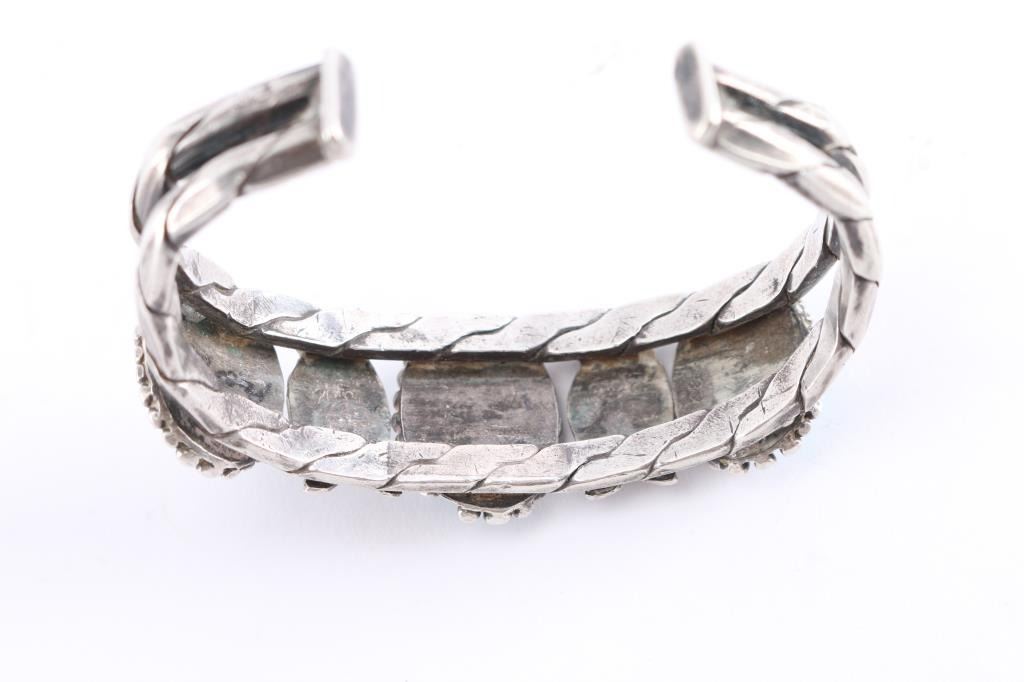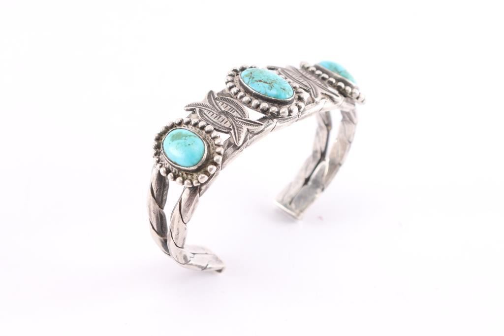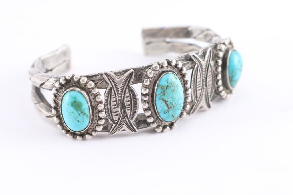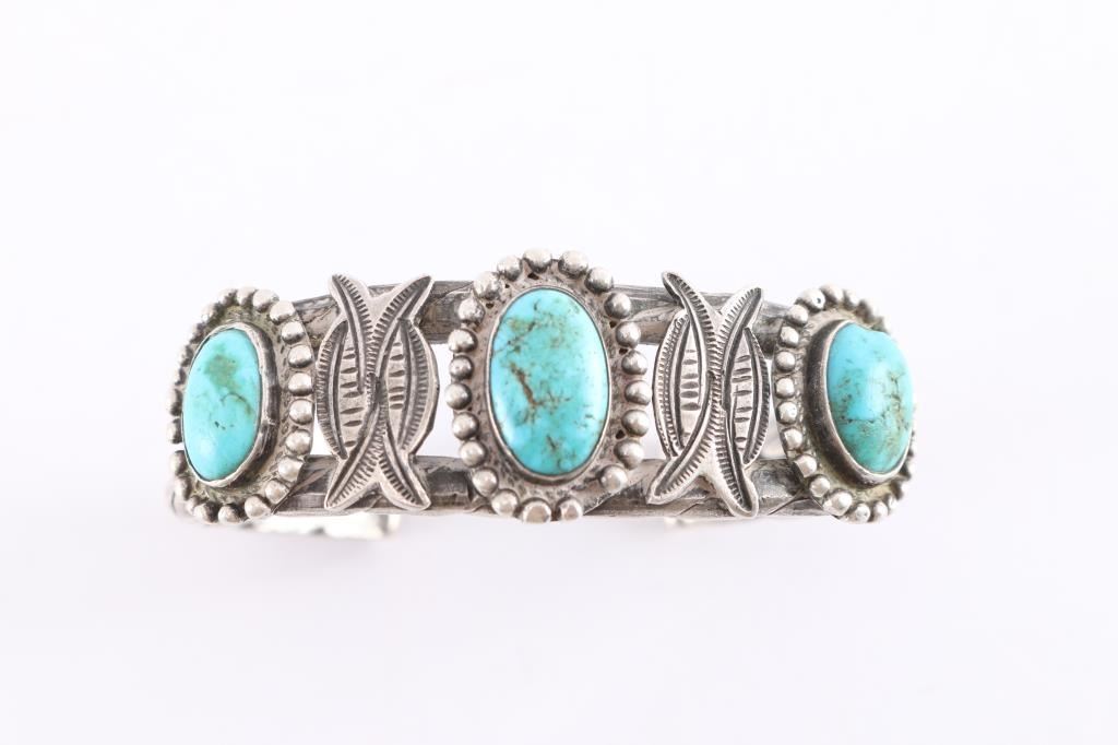 Measures 8" with gap. Oval turquoise stones are a blue green with nice matrix.