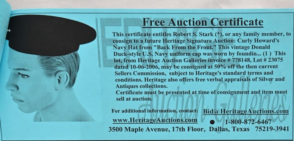 Curly Howard's Navy prop hat used in the 3 Stooges film, "Back From The Front". Provenance includes COA