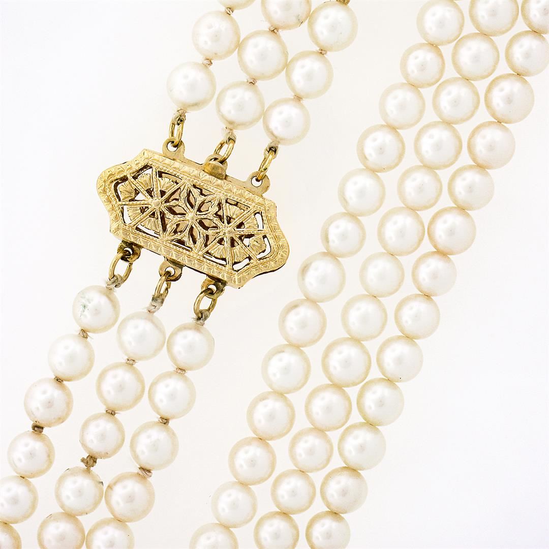 3 Strand 4-4.5mm Cultured Pearl Necklace w/ 14k Yellow Gold Wide Filigree Clasp