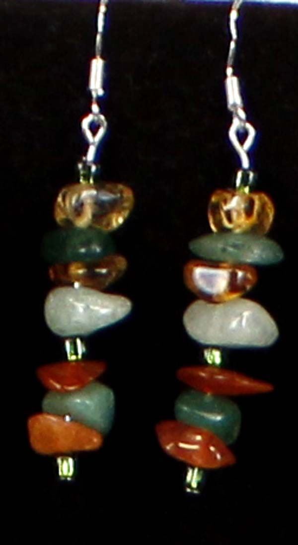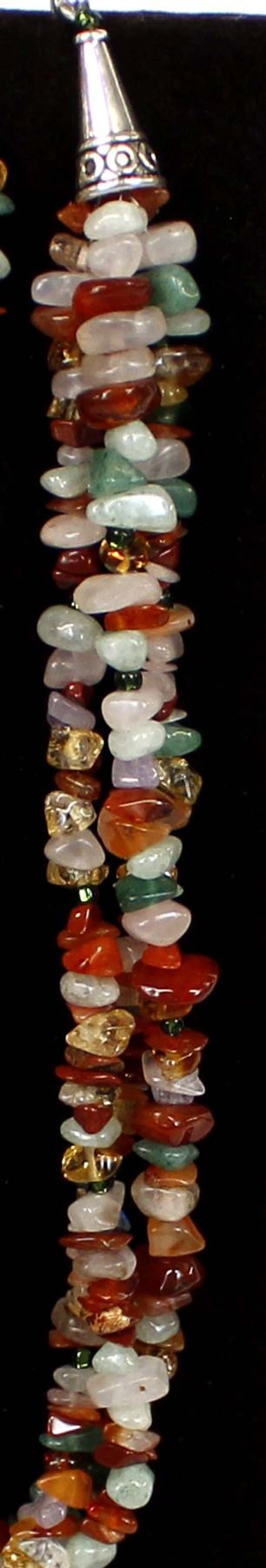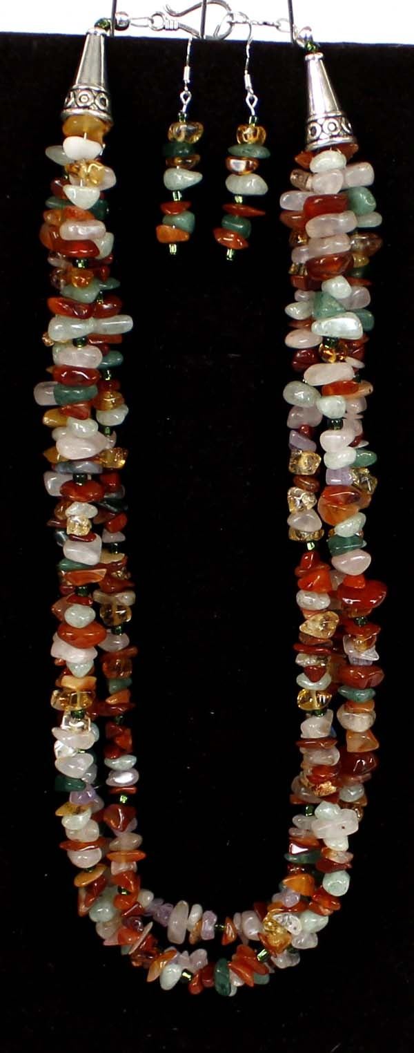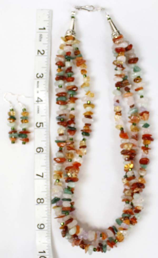 Quail Ridge Studios One of a Kind 3 Strand Multi-Agate & Stone Necklace & Earrings by Larry McLellan. These pieces include Jasper, citrine, pink quarts and crystal. Necklace is 18'' end to end and earrings are 2'' long. The magic of the Desert Southwest is timeless in its display of open landscapes, sunrise and sunset colors with infinite possibilities of artistic expression. The design studio of Quail Ridge was founded on these possibilities, forging an endless variety of earthen gems to their metallic counterparts. The artist, Larry McLellan, designs jewelry contemporary in style, while maintaining elements of native designs.