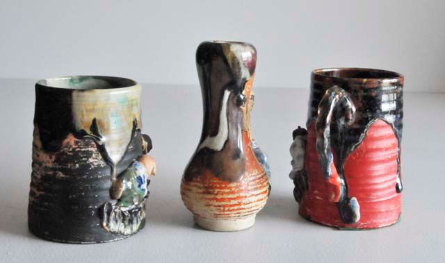Including: 1- With relief of "9 Men Looking In", with impressed mark, approx. 10" x 9.5" x 2.5". 1- With relief of "3 Men Looking in", approx. 9.5" D x 3" H. 1- with relief of "3 Monkeys Looking In", approx. 5" D x 3.5" H.