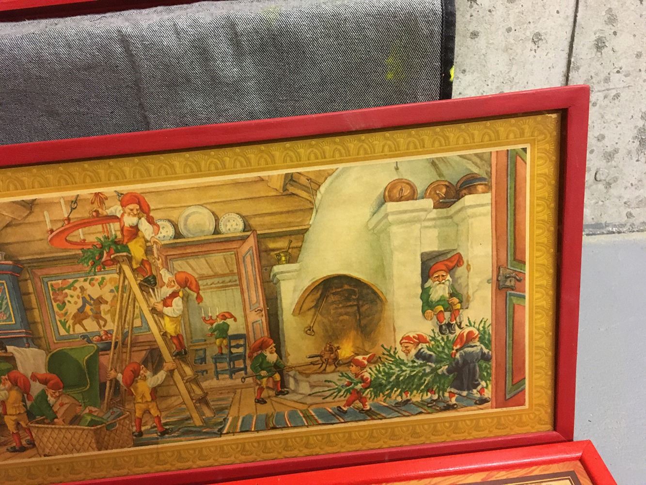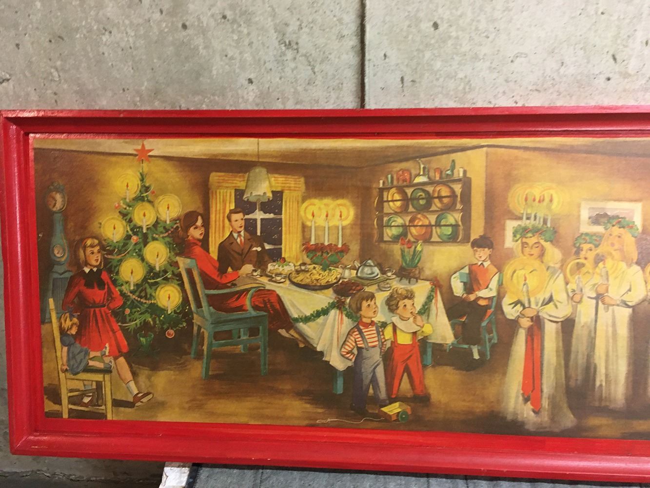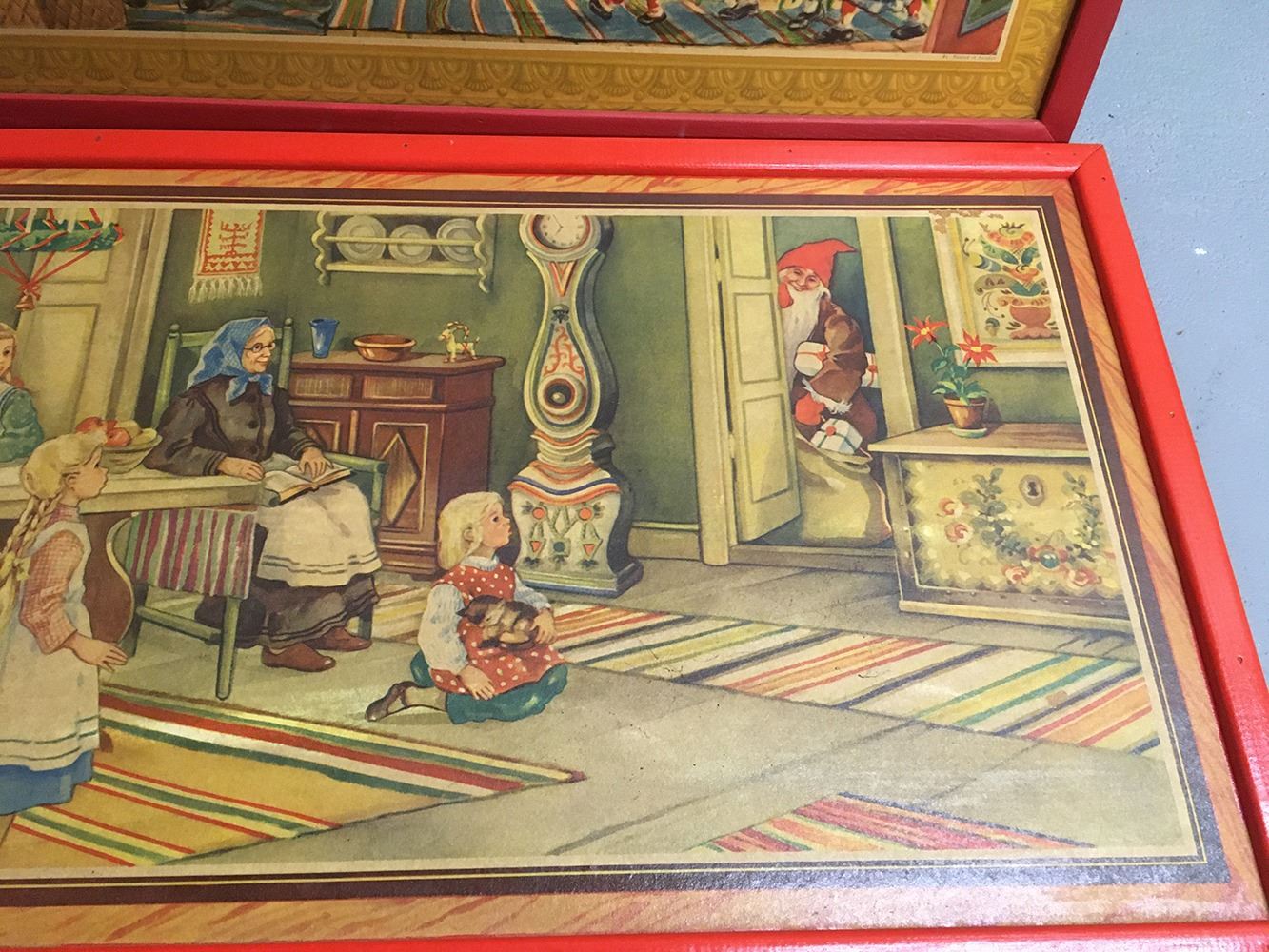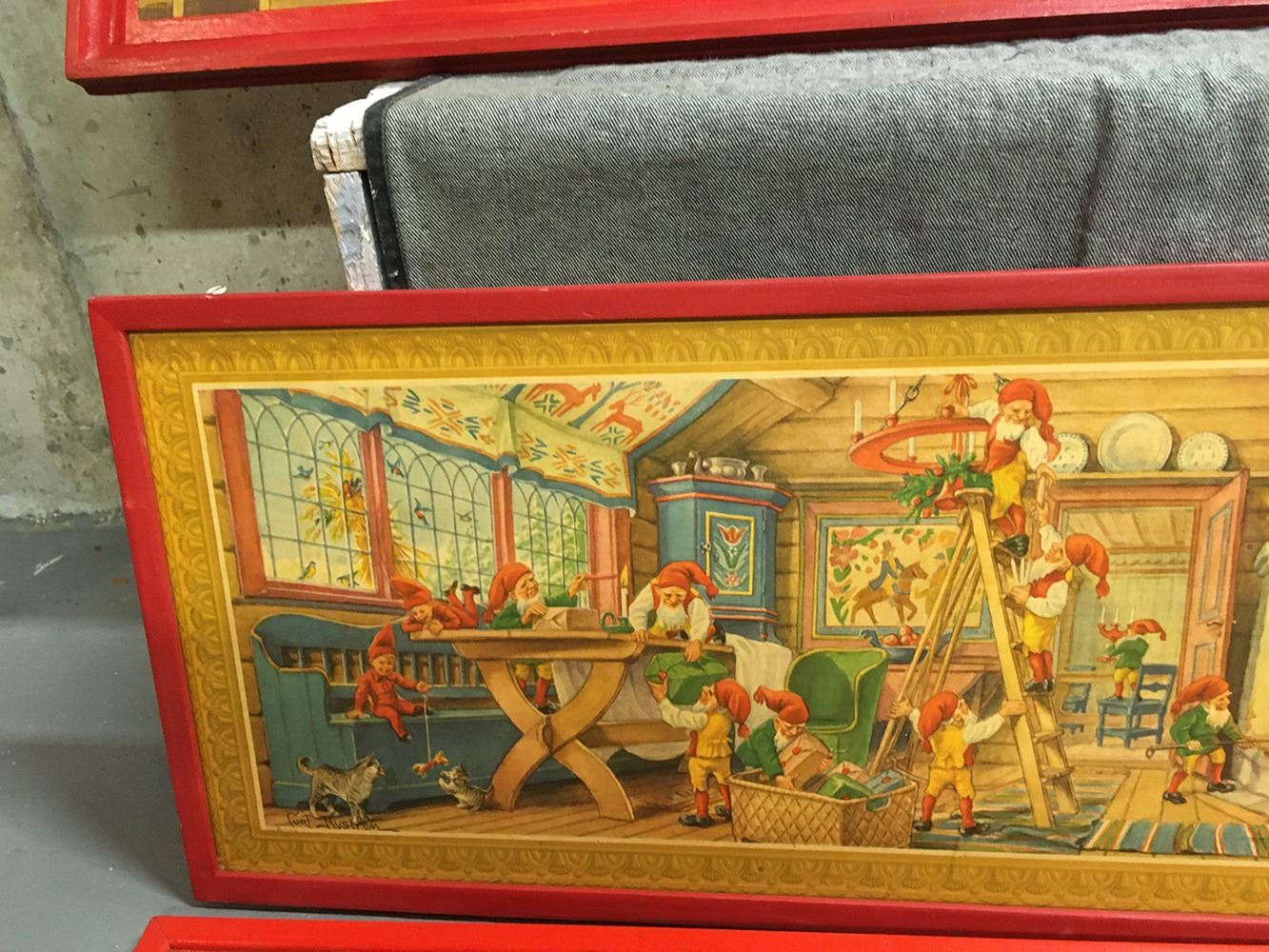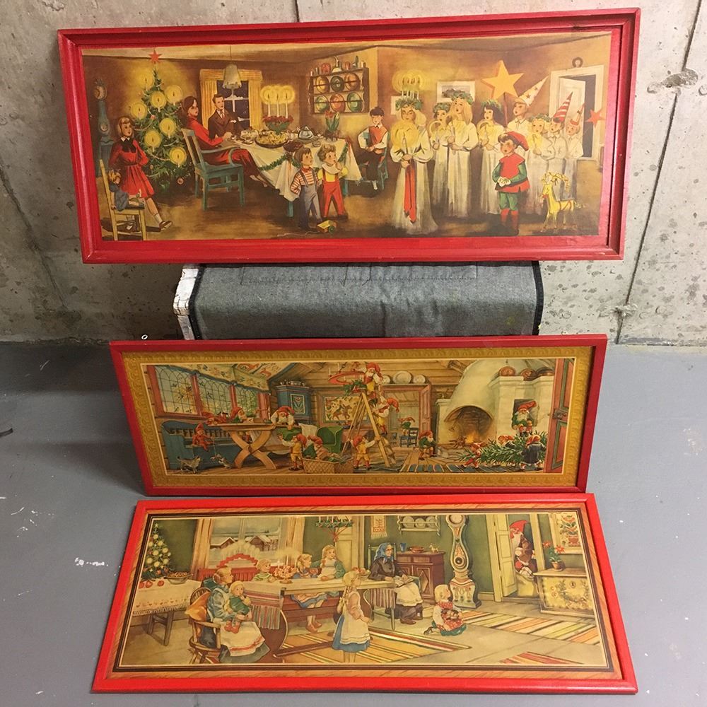 3 vintage Swedish Christmas scenes on board, with red frames, measures approx. 36 inches x 15 inches.