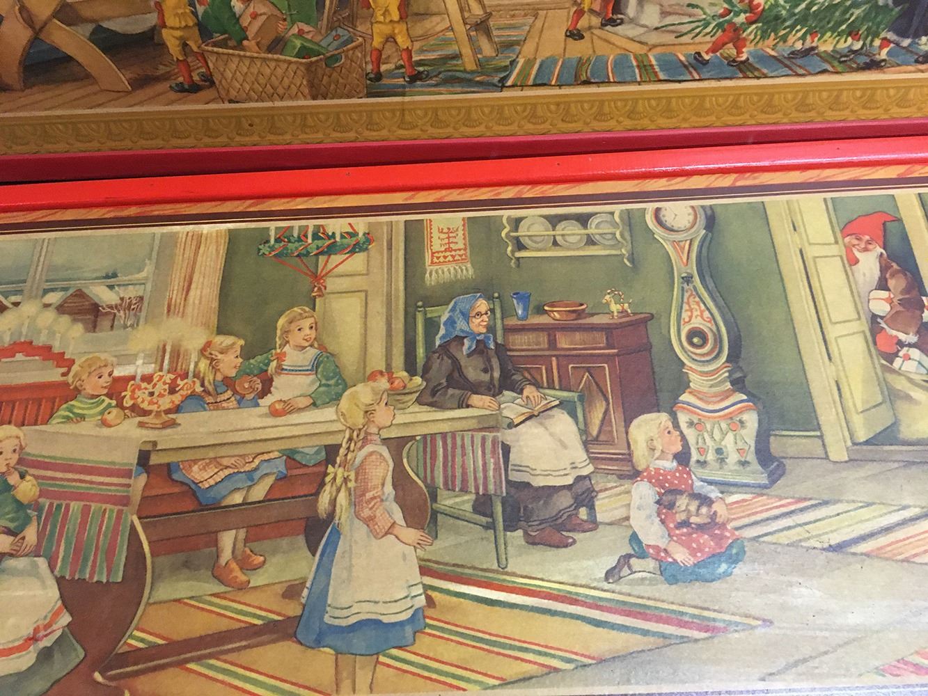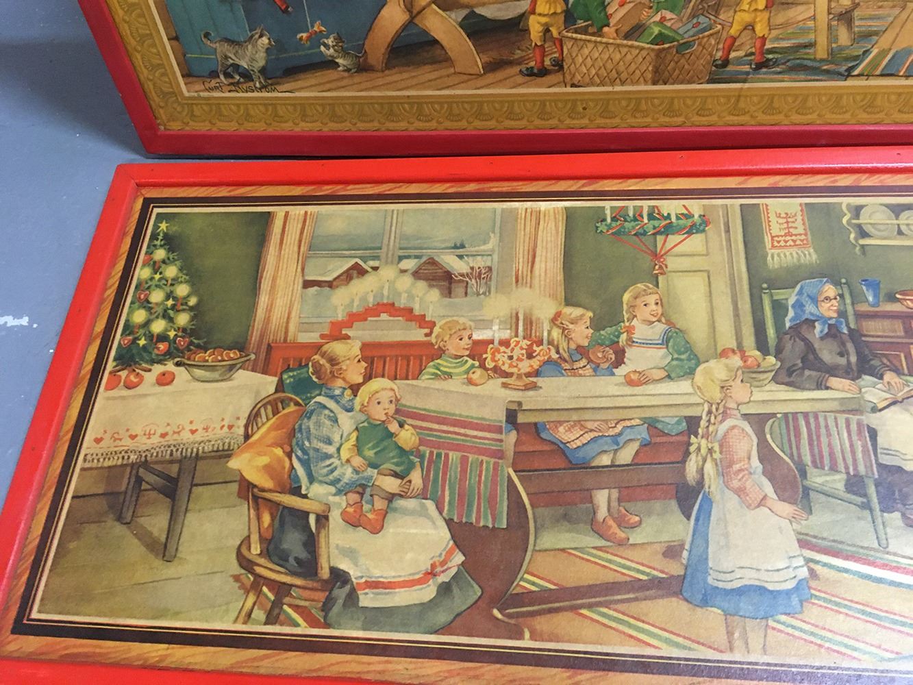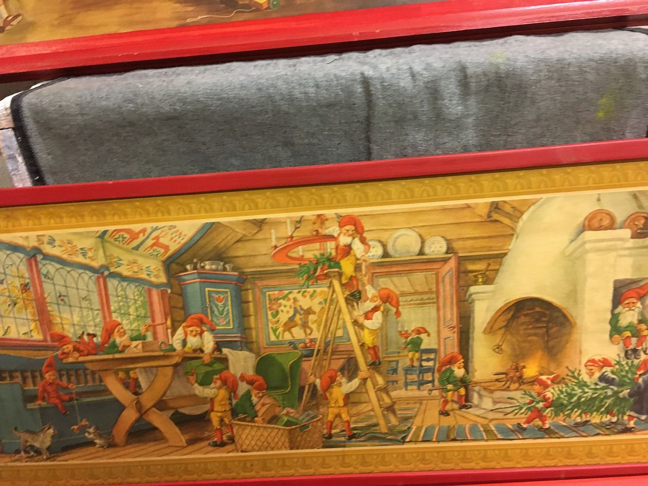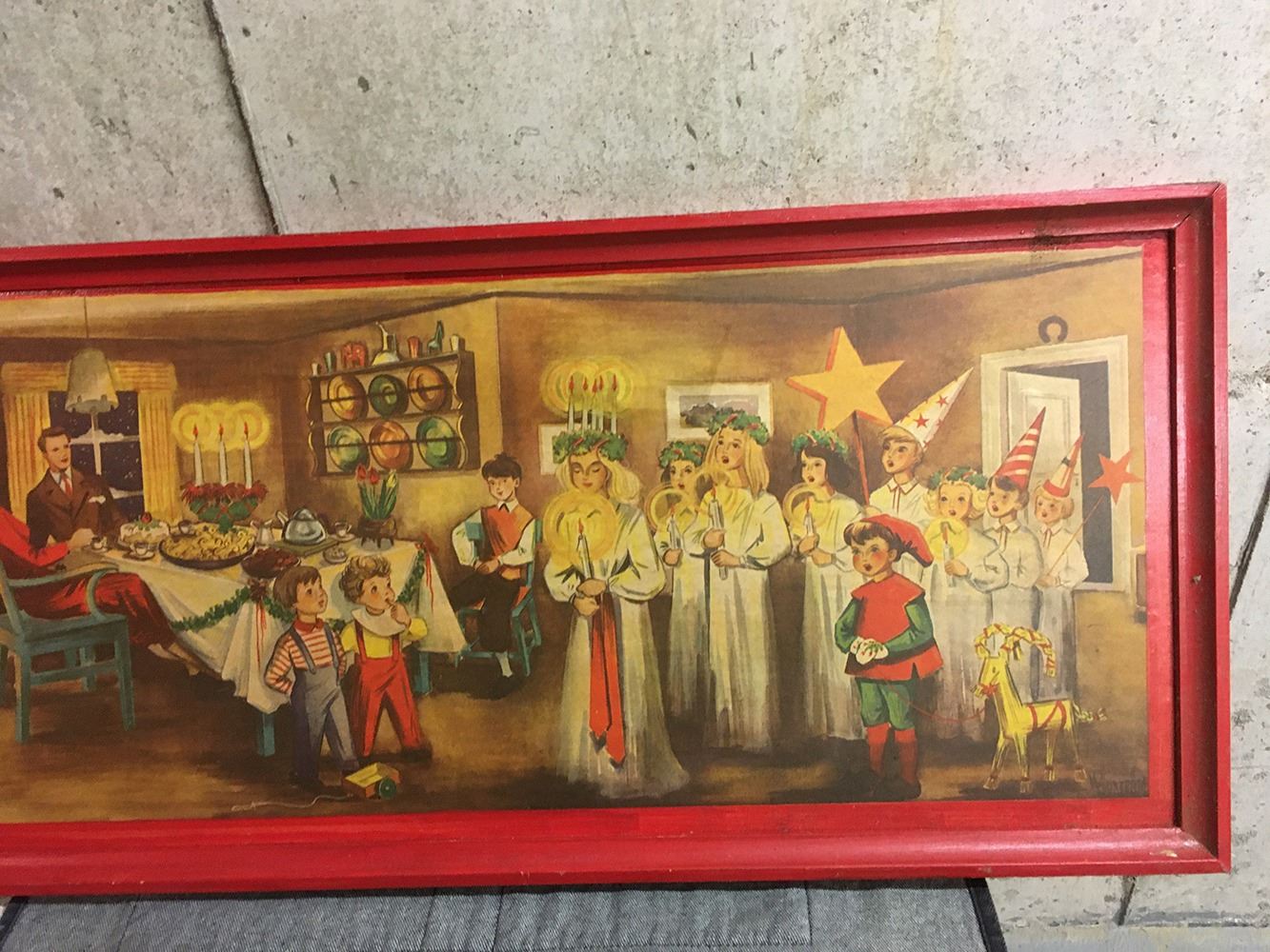 3 vintage Swedish Christmas scenes on board, with red frames, measures approx. 36 inches x 15 inches.