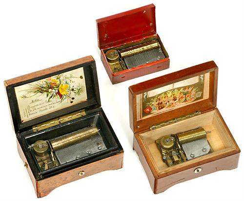 3 Swiss Musical Boxes 1) Signed on tune sheet "Mermod Frères", for 2 melodies, comb complete, wooden case (5 x 3 x 2 1/3 in.), good working condition! - 2) Unmarked, brass barrel for 3 melodies, comb complete, wooden case (5 x 3 1/2 x 2 3/4 in.), good playing condition. - And: 3) Unmarked, in metal case, brass barrel for 2 melodies, comb complete, dimensions 3 1/2 x 2 x 1 2/5 in.), good playing condition!<Br>