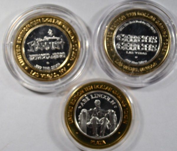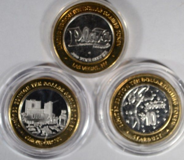 STARDUST, CIRCUS CIRCUS, AND PLAZA. EACH TOKEN CONTAINS .6 OUNCES .999 SILVER, EST. $90.00 TO $95.00