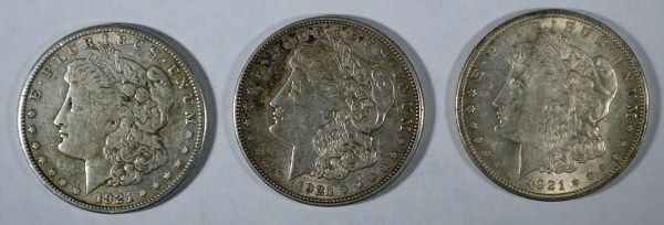 1921-P, 1921-D, AND 1921-S MORGAN SILVER DOLLARS, A GREAT WAY TO BUY SILVER AND OWN A PIECE OF AMERICAN HISTORY, EST. $105.00 TO $115.00