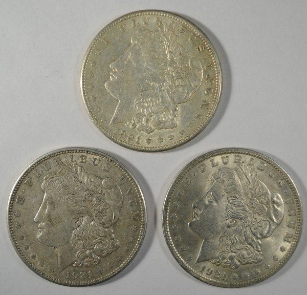 1921-P, 1921-D, AND 1921-S MORGAN SILVER DOLLARS, A GREAT WAY TO BUY SILVER AND OWN A PIECE OF AMERICAN HISTORY, EST. $105.00 TO $115.00