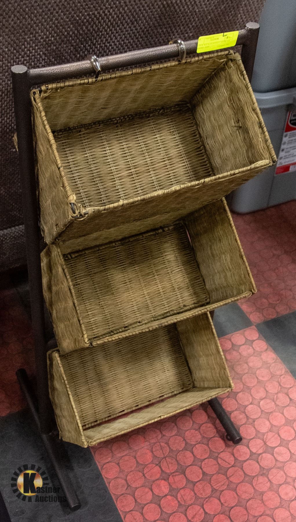 3 REMOVEABLE STORAGE BASKETS WITH ANTIQUE BRONZE METAL STAND - 34" TALL, BASKETS ARE 12"L X 7"W X 7.5" DEEP **ALL ITEMS MUST BE REMOVED BY 5PM SATURDAY, JUNE 29TH 2024. ALL REMAINING ITEMS WILL BE SUBJECT TO A $6.00 PER DAY STORAGE CHARGE. ANY ITEMS REMAINING AFTER MONDAY, JULY 15TH 2024 WILL BE CONSIDERED FORFEITED. NO REFUNDS WILL BE ISSUED FOR FORFEITED ITEMS. TO SCHEDULE A PICK UP APPOINTMENT CLICK HERE