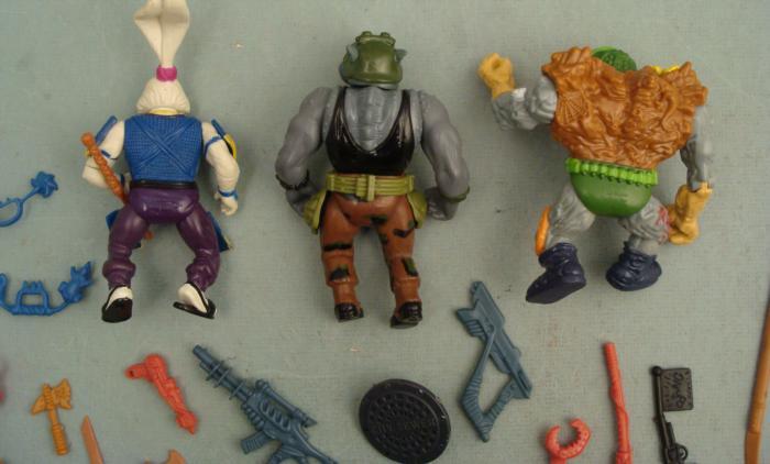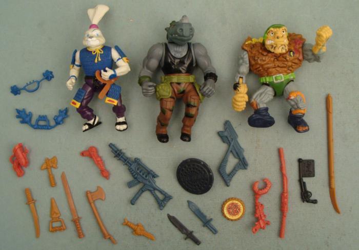 These three figures are from the original series of Teenage Mutant Ninja Turtles figures. They include a Usagi "The Retro-rocketing Rabbit, " Rock Steady, and one mutant we're not familiar with. These were put out by Mirage Studios in 1989. They are in excellent condition, and there's a bunch of extra weapons and accessories thrown in.