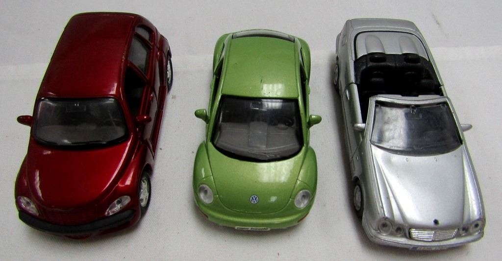 VW BUG, PT CRUISER, & MERCEDES-BENZ CLK CABRIOLET. ALL ARE 1/37 OR 1/38 SCALE.