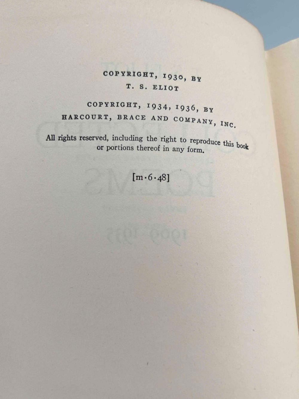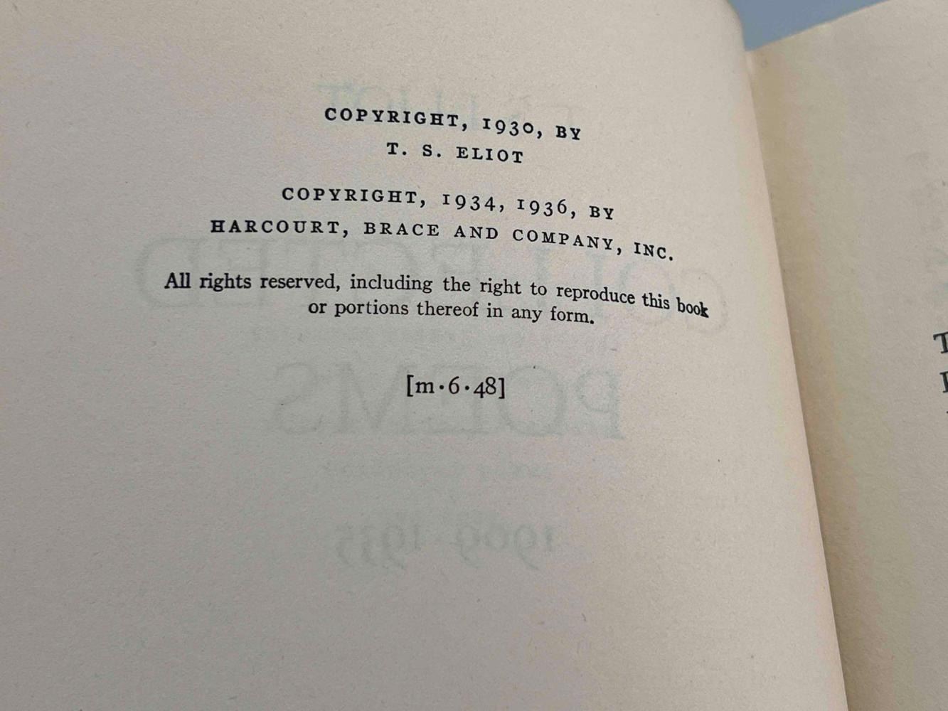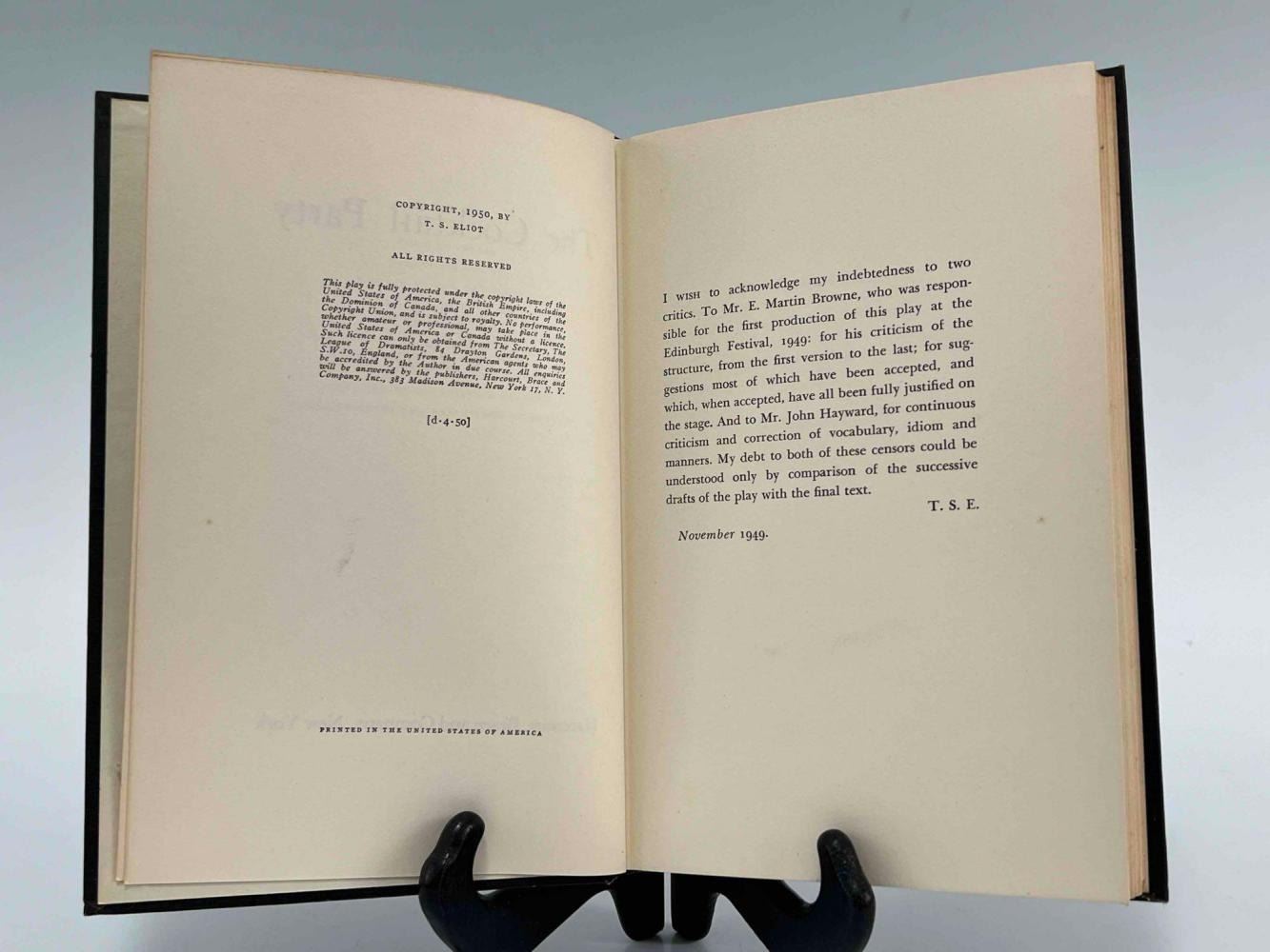 3 TS Eliot Books. The Cocktail Party, Collected Poems 1999-1935, Four Quartets. Harcourt, Brace And Company, New York. Collected Poems Copyright 1930, Four Quartets Copyright 1943, The Cocktail Party Copyright 1950. Largest Item Approximately 8.675 L x 5.875 W x 0.75 D Inches. Smallest Item Approximately 8.625 L x 5.75 W x 0.75 D Inches.
