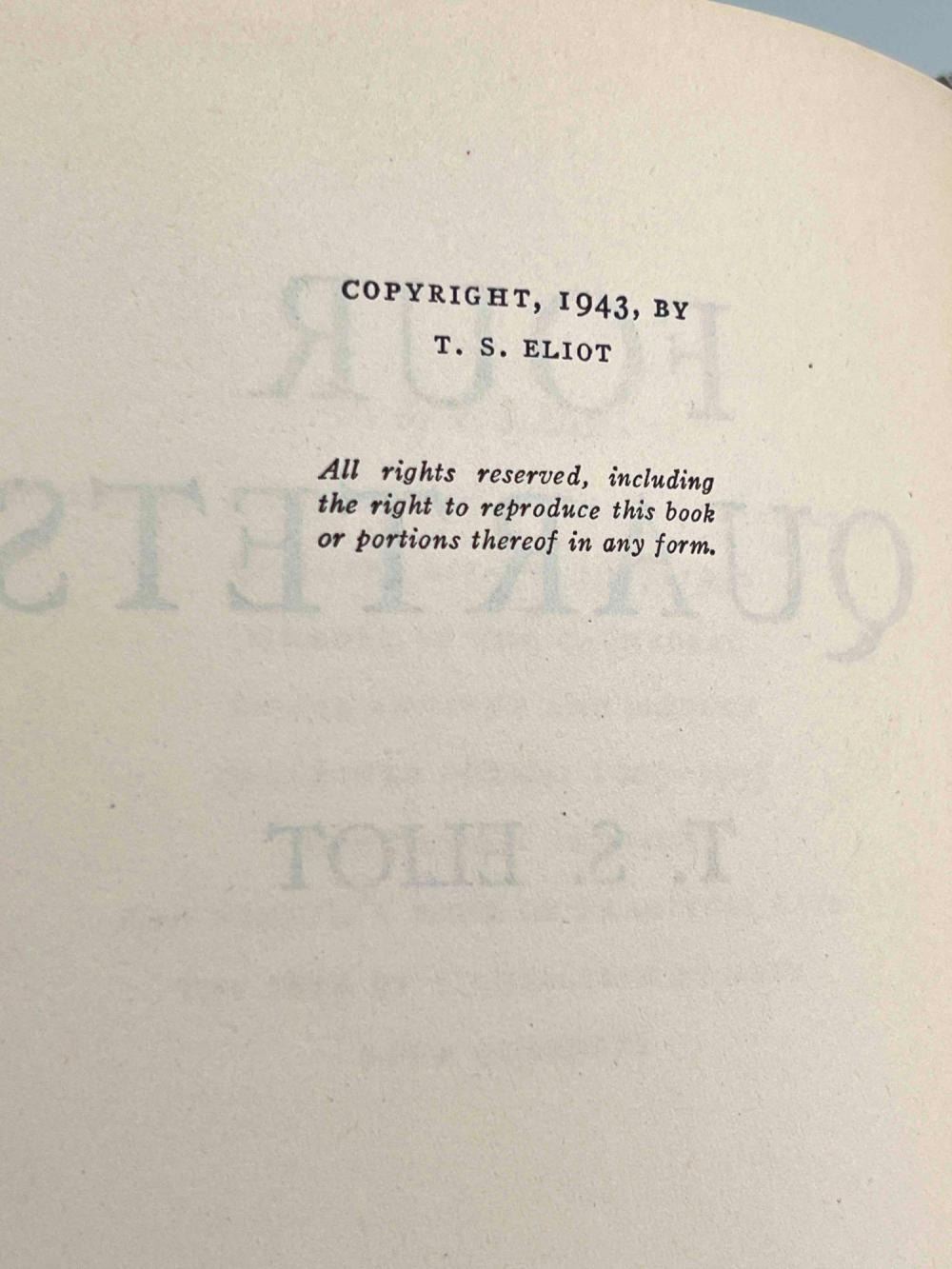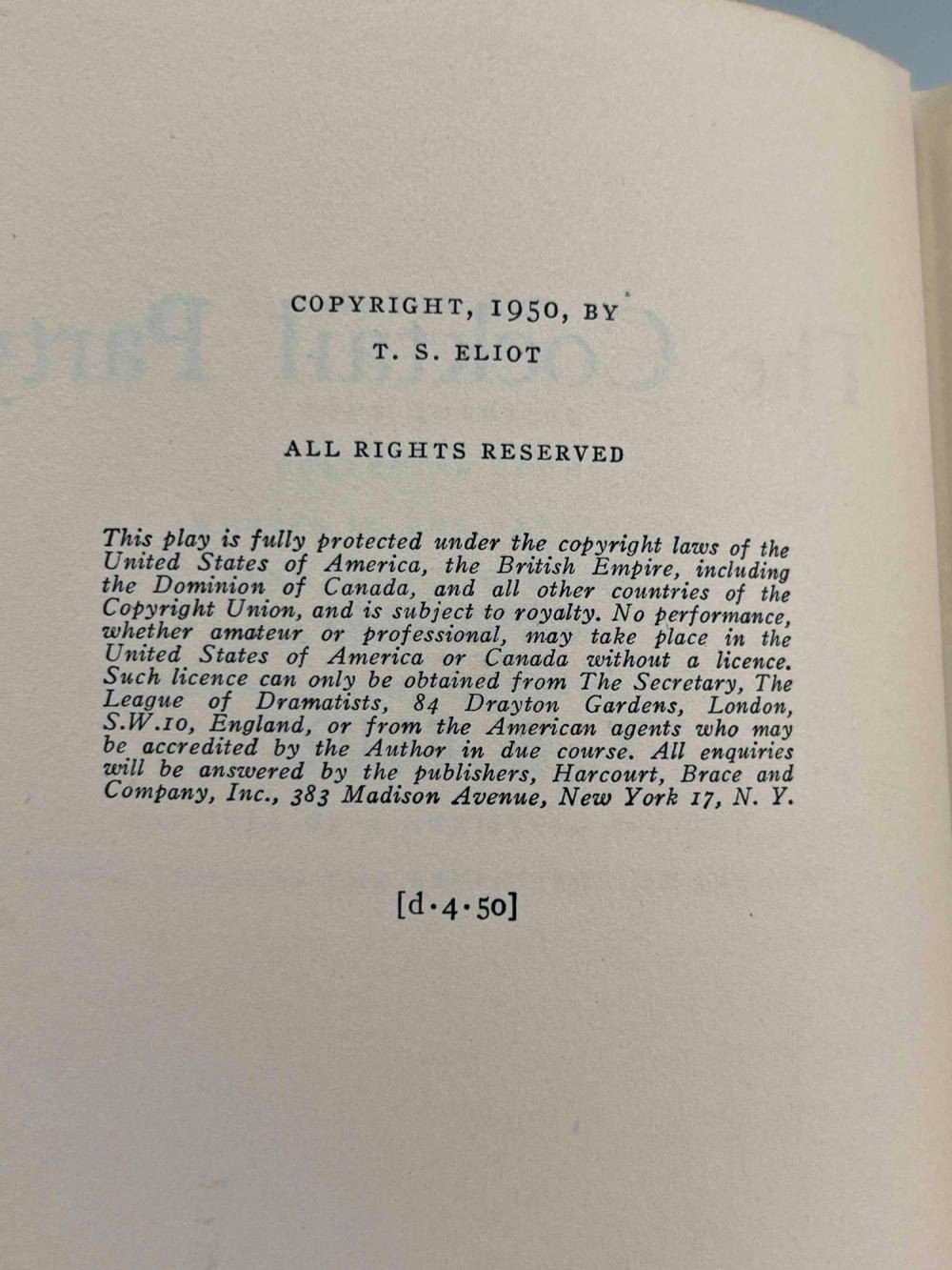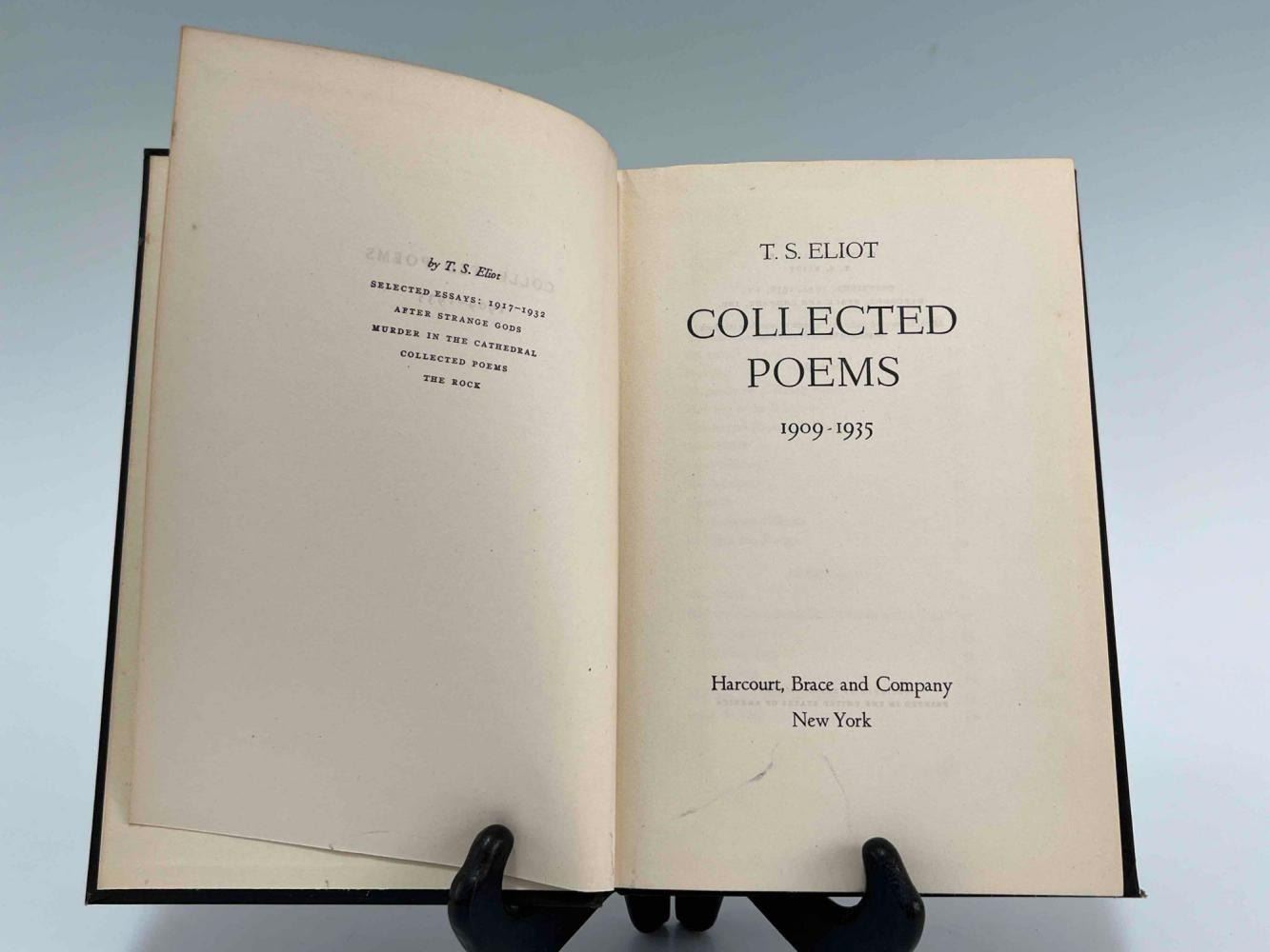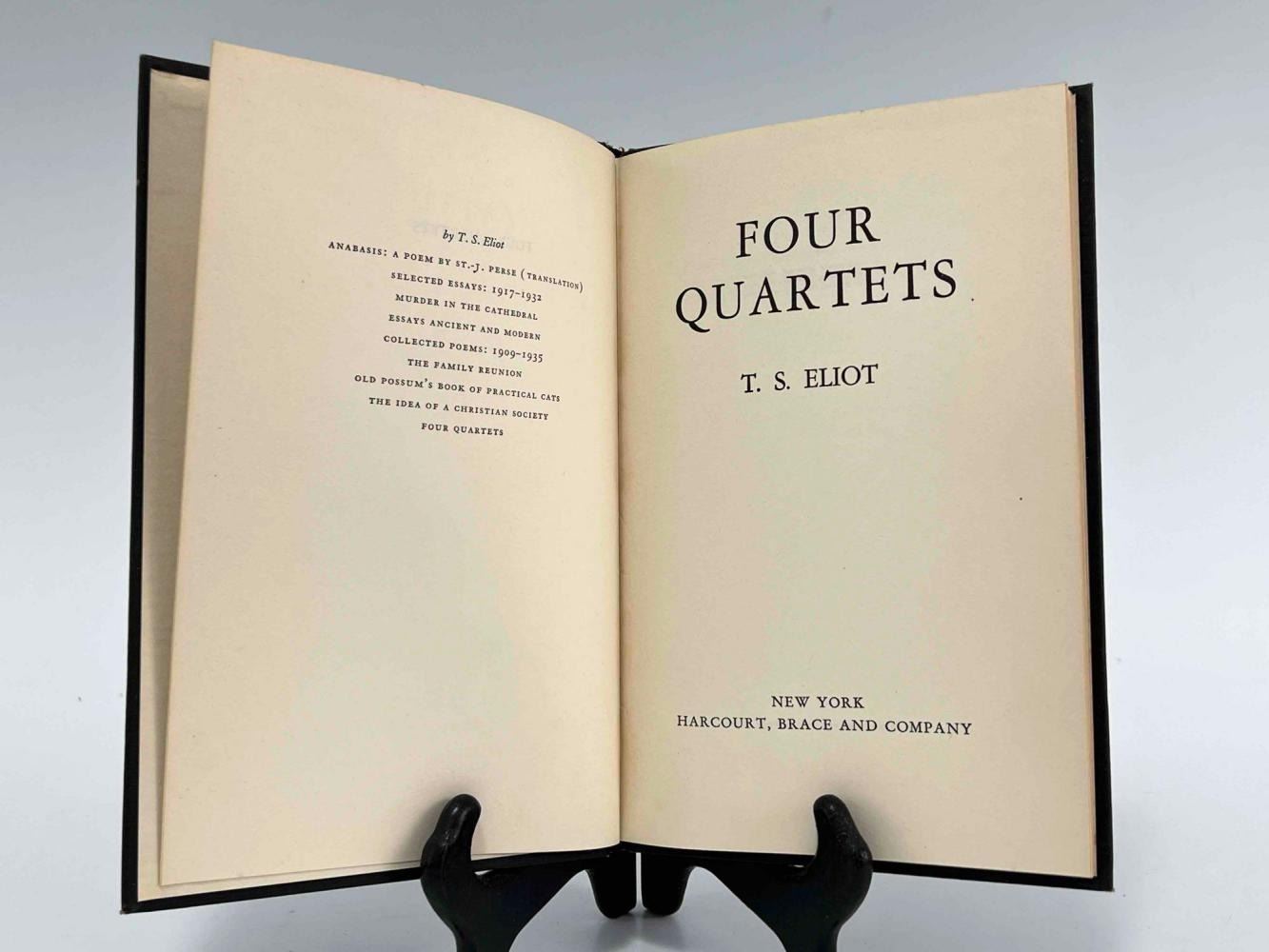 3 TS Eliot Books. The Cocktail Party, Collected Poems 1999-1935, Four Quartets. Harcourt, Brace And Company, New York. Collected Poems Copyright 1930, Four Quartets Copyright 1943, The Cocktail Party Copyright 1950. Largest Item Approximately 8.675 L x 5.875 W x 0.75 D Inches. Smallest Item Approximately 8.625 L x 5.75 W x 0.75 D Inches.