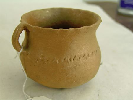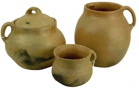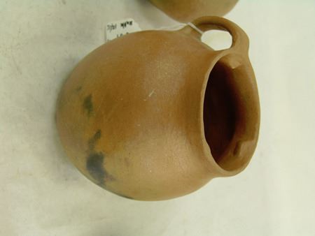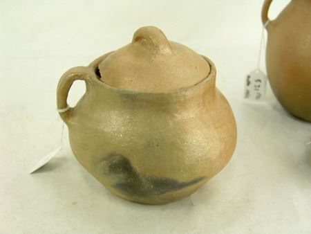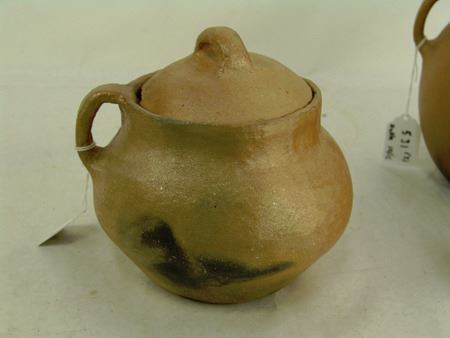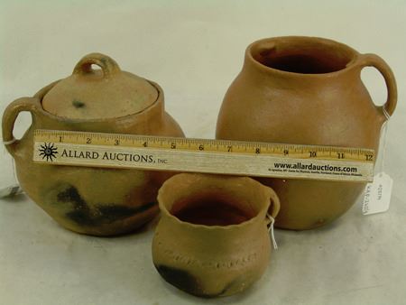 Ca. 1970s-1980s, Collection of three traditional mica clay pottery items including a large and a small pitcher, both in very good condition, and a cup with damage to the lid. Largest 7" x 6-1/2"