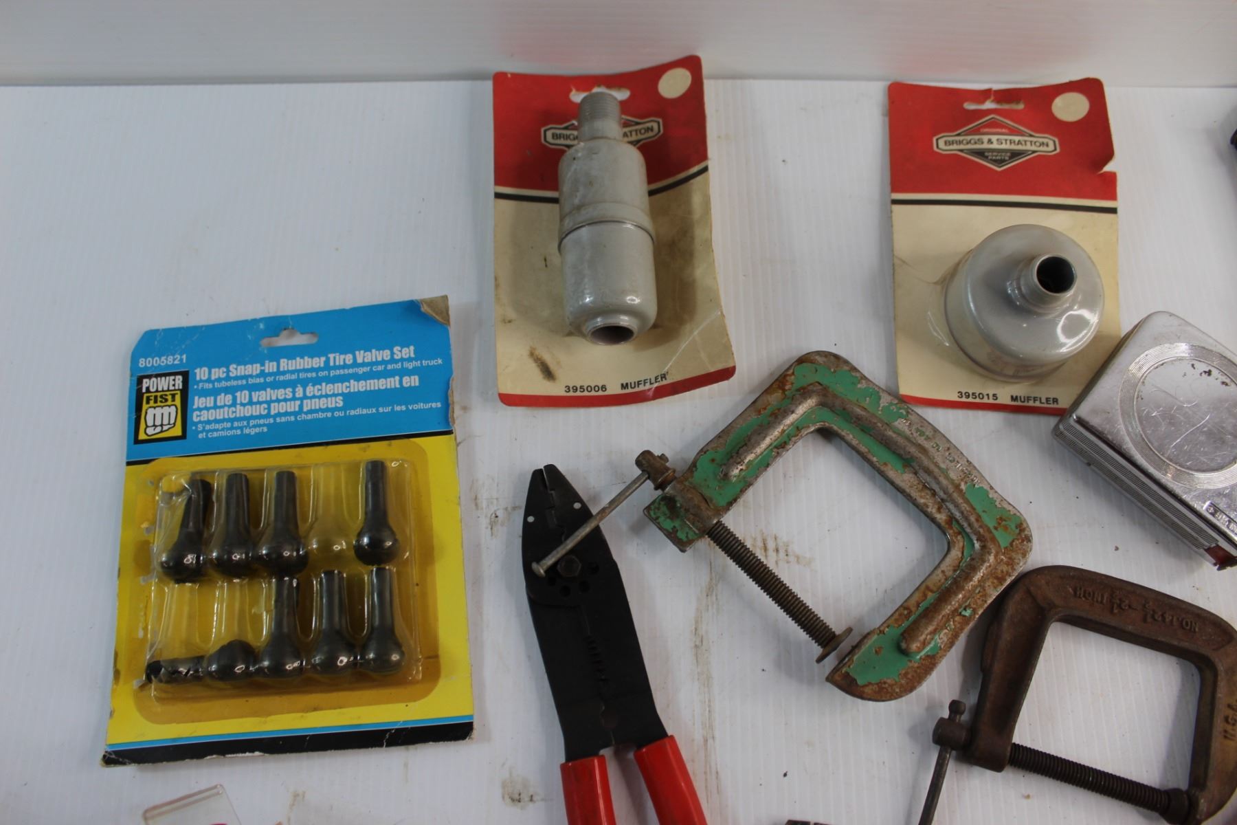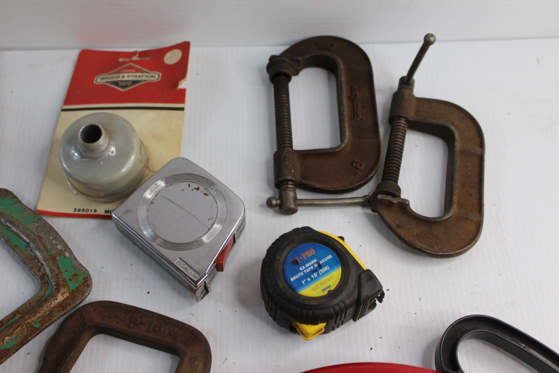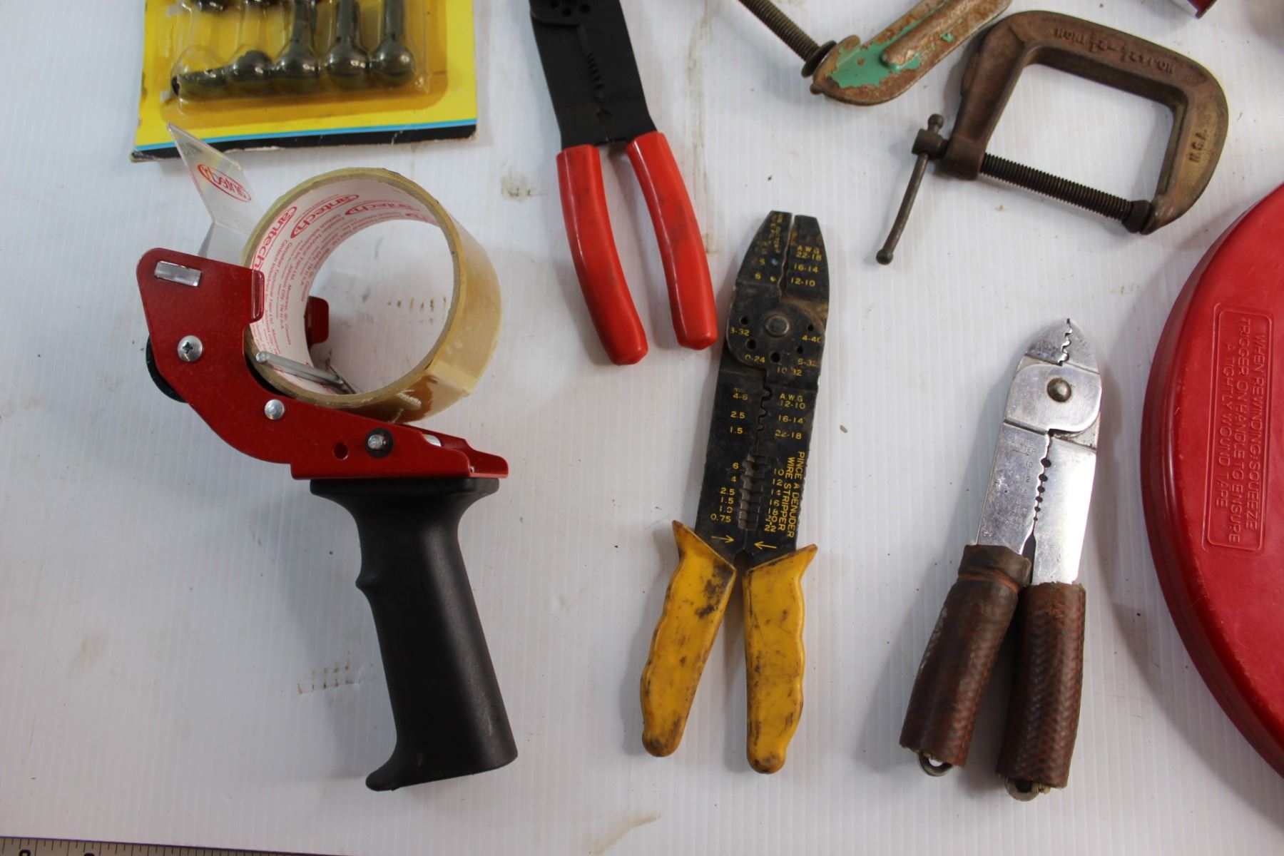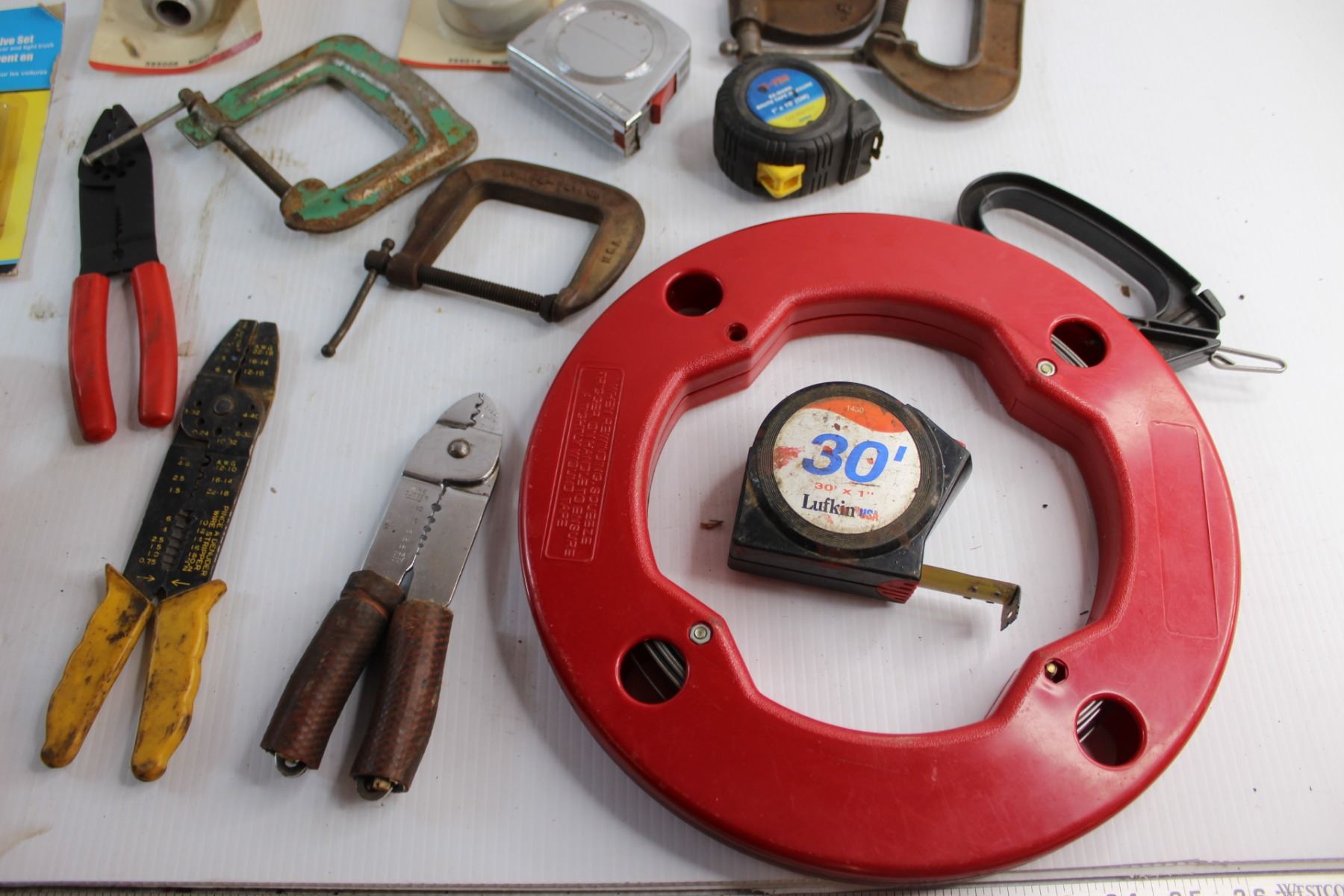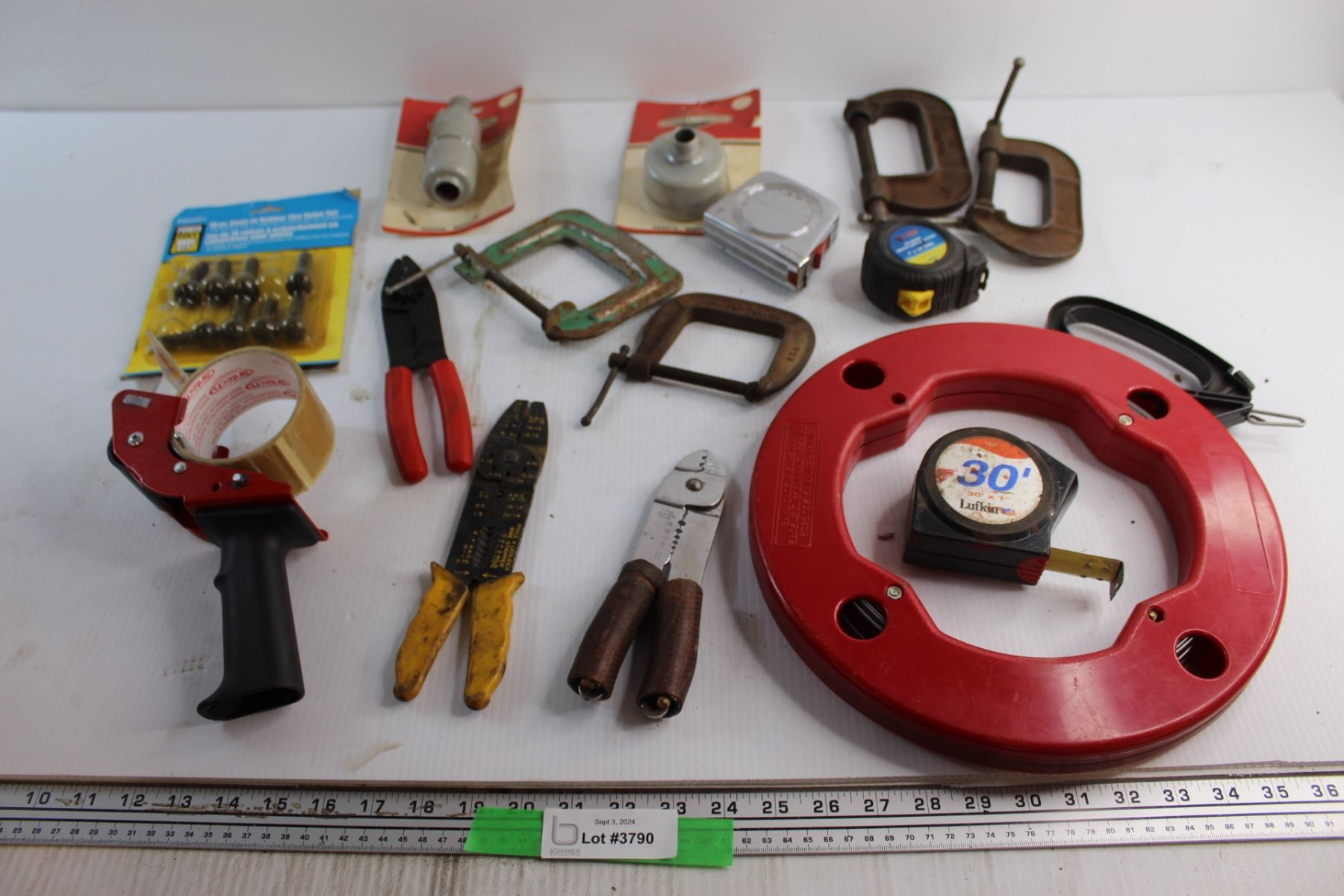 (3) Tape Measures, (4) C - Clamps. (3) Wire Strippers and Assorted Items