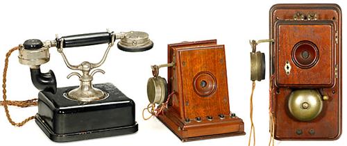 3 Telephone 1) Tischfernsprecher "ZB 08", Hersteller: "Groos & Graf, Berlin", Metallgehäuse, komplett, sehr interessantes Sammlungsstück. (4/2) - Und: 2 Haustelephone (Wand- und Tischapparat), Linienwähler für 2 und 5 Leitungen, Holzgehäuse. (4/4)