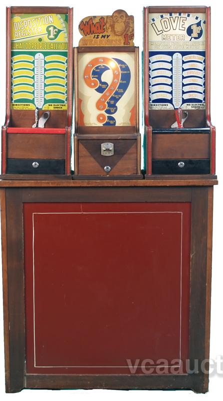 3 "Tester" Game Machines On Base: 1 Cent "Disposition Register" Squeeze Machine, 1 Cent "What Is My Weakness" Machine & 1 Cent "Love Meter" Squeeze Machine, Each MFG By Exhibit Supply Co. Chicago.