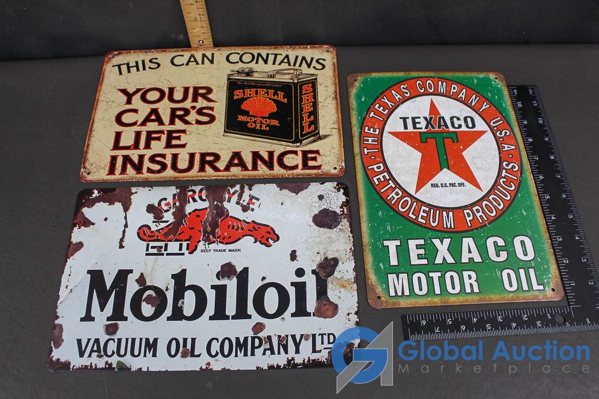 (3) Texaco, Shell & Mobiloil Tin Signs
