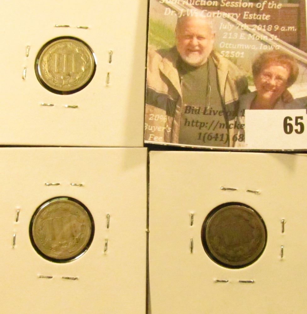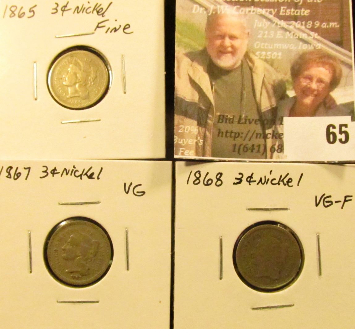 (3) Three Cent Nickels: 1865 Fine, 1867 VG, & 1868 VG-F.