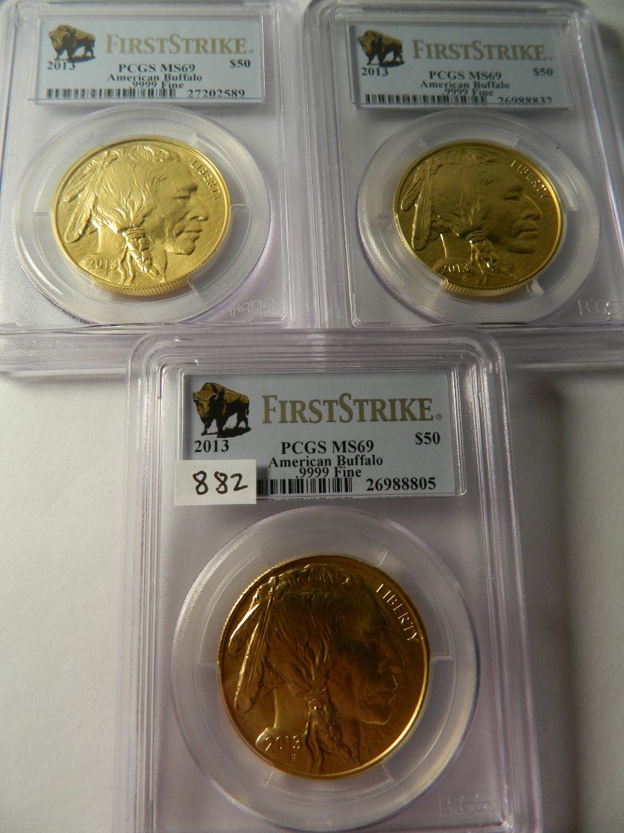 (3) Three Gold 2013 $50 U.S. Buffalo, PCGS MS69 First Strike, One Ounce Fine Gold Each