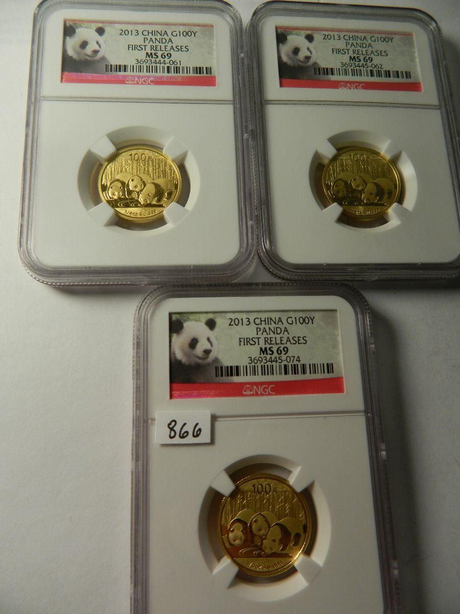(3) Three Gold China 2013 100Y Panda, NGC MS69 First Releases, 1/4 ounce Fine Gold Each, all one $