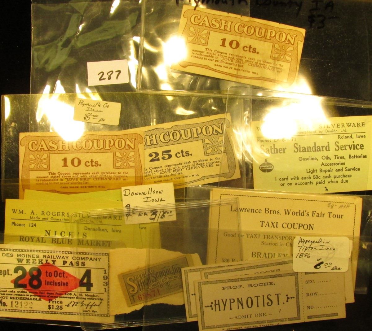 (3) Tickets with stubs "Prof. Roche Hypnotist Admit One", 'Doc' says he appeared in Tipton, Iowa in 1896; scrip "Special High School Ticket Des Moines City Railway Company"; "Des Moines Railway Company Weekly Pass…1931"; (8) "Lawrence Bros. World's Fair Tour Taxi Coupon(s) Good for TAXI TRANSPORTATION from Railroad Station in Chicago to Bardley Hotel..."; (7) Scrip from "...Nick's Royal Blue Market ...Donnelson, Iowa" advertising Wm. A. Rogers Silverware; Scrip "Sather Standard Service...Roland, Iowa..." advertising Wm. A. Rogers Silverware; "Cash Coupon (2)10 cts (& one) 25cts.. ...redeemable in "Love Bird" Chinaware according to our profit-sharing list" 'Doc' says this was Plymouth County, Iowa scrip;