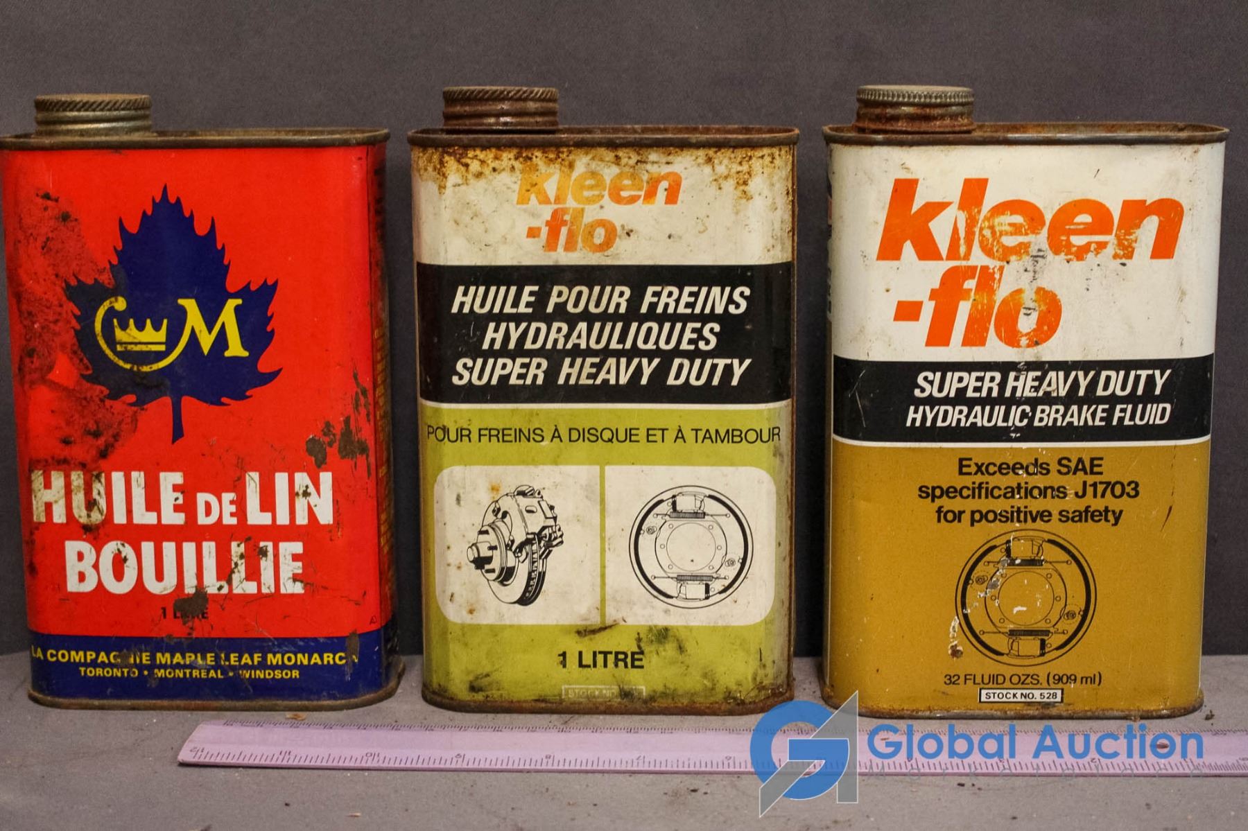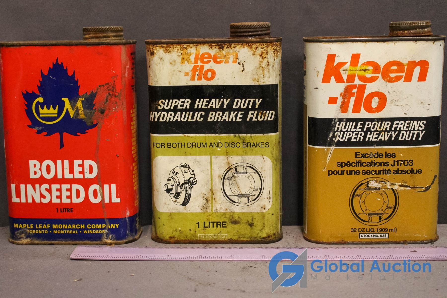 (3) Tins w/Contents (Brake Fluid, Linseed Oil)