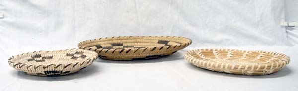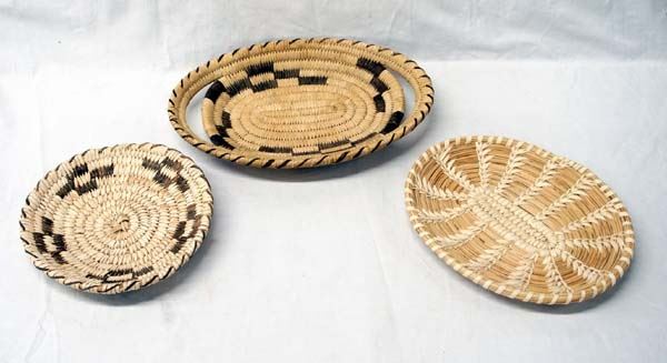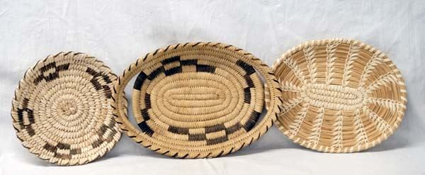 3 Tohono O'odham Baskets. We have a small 2 colored basket that measures approx. 8'' in diameter and stands 1'' tall, An oval basket measuring 9.5'' x 7.5'' x .5'', and a handled two-toned basket measuring 11'' x 8'' and standing 1.5'' tall.