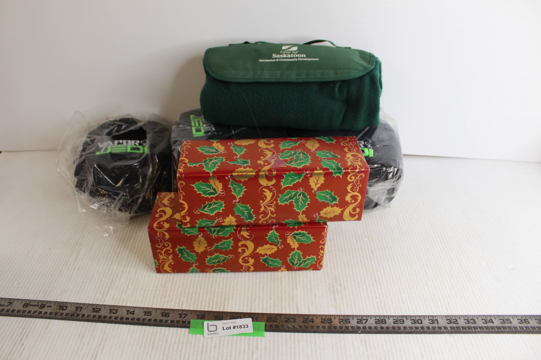 (3) Toque Packs (1 Opened), City of Saskatoon Blanket, Christmas Wrapped Boxes