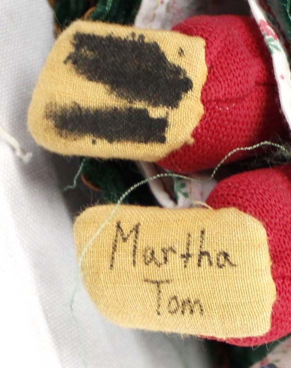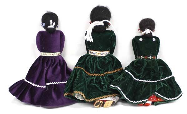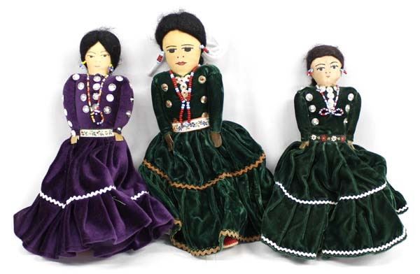 3 Traditional Native American Navajo Cloth Dolls, largest measures 10''L, one doll is by Martha Tom and is signed on the bottom of the moccasin, embellished with beads, sequins, and all are wearing traditional dresses