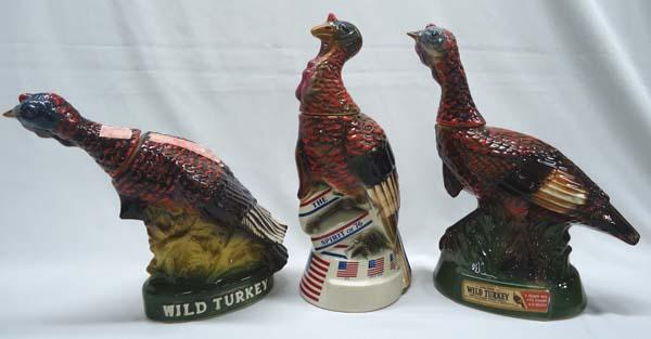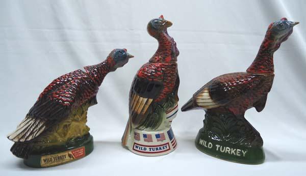 3 Turkey Decanters. Largest measures approx. 12''H x 5 1/4''. 1. Austin Nichols Wild Turkey, 101 Proof, Limited Edition, Ceramic No.5. 2. Austin Nichols Wild Turkey, 101 Proof, Limited Edition, Ceramic No.6. 3. Austin Nichols Wild Turkey, 101 Proof, Limited Edition, Ceramic No.7. Buyers Pay Actual Shipping and Handling Charges(see terms and conditions for more information).