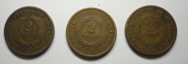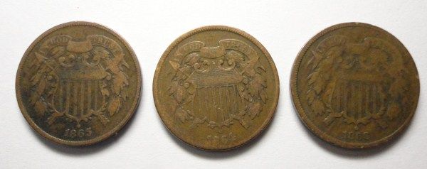 (3) Two Cent Pieces, 1864 Fine, 1865 Fine, 1866 VG EST $65-75